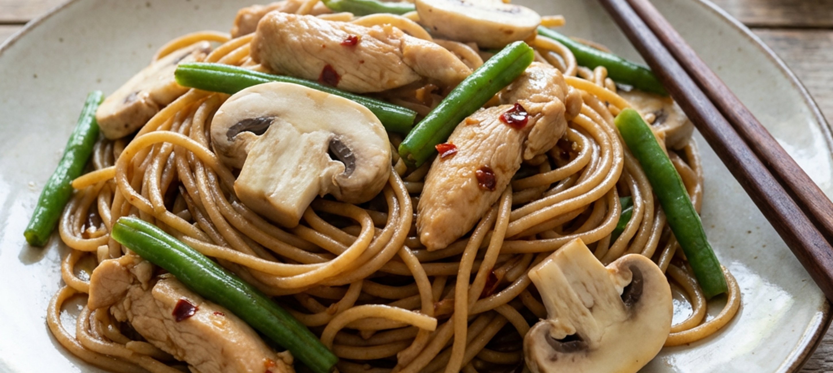 - 5Hotové špagety sceďte, přimíchejte ke kuřecí směsi a prohřejte na pánvi přibližně 1 minutu na středním plameni. Hotový kuřecí chow mein rozdělte na 3 porce a podávejte.