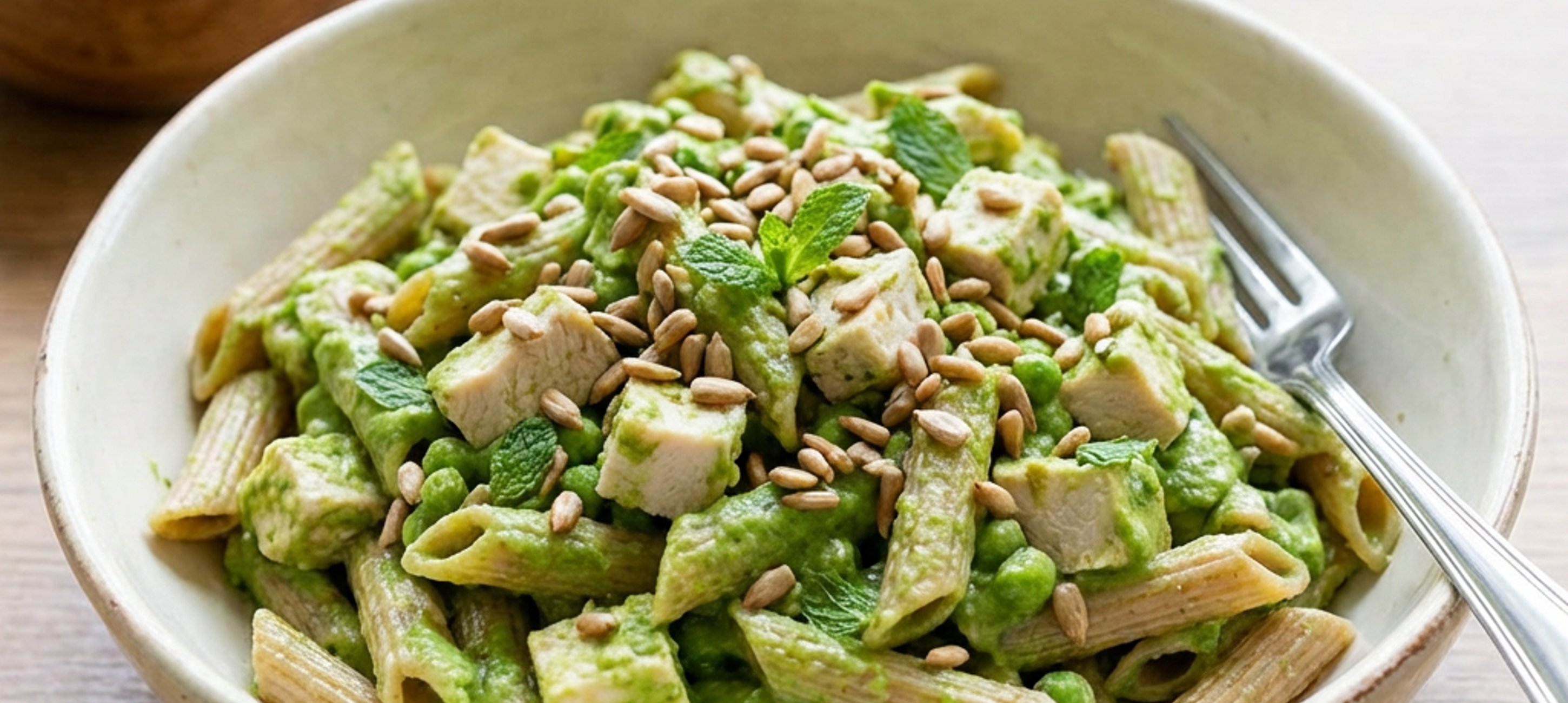 - 2Mezitím si připravte zálivku. Do vyšší nádoby dejte rozmražený hrášek, baby špenát, jogurt, mletou papriku, chilli vločky, citronovou šťávu, najemno nasekanou mátu a 20 g slunečnicových semínek. Vše za pomocí tyčového mixéru rozmixujte dohladka.