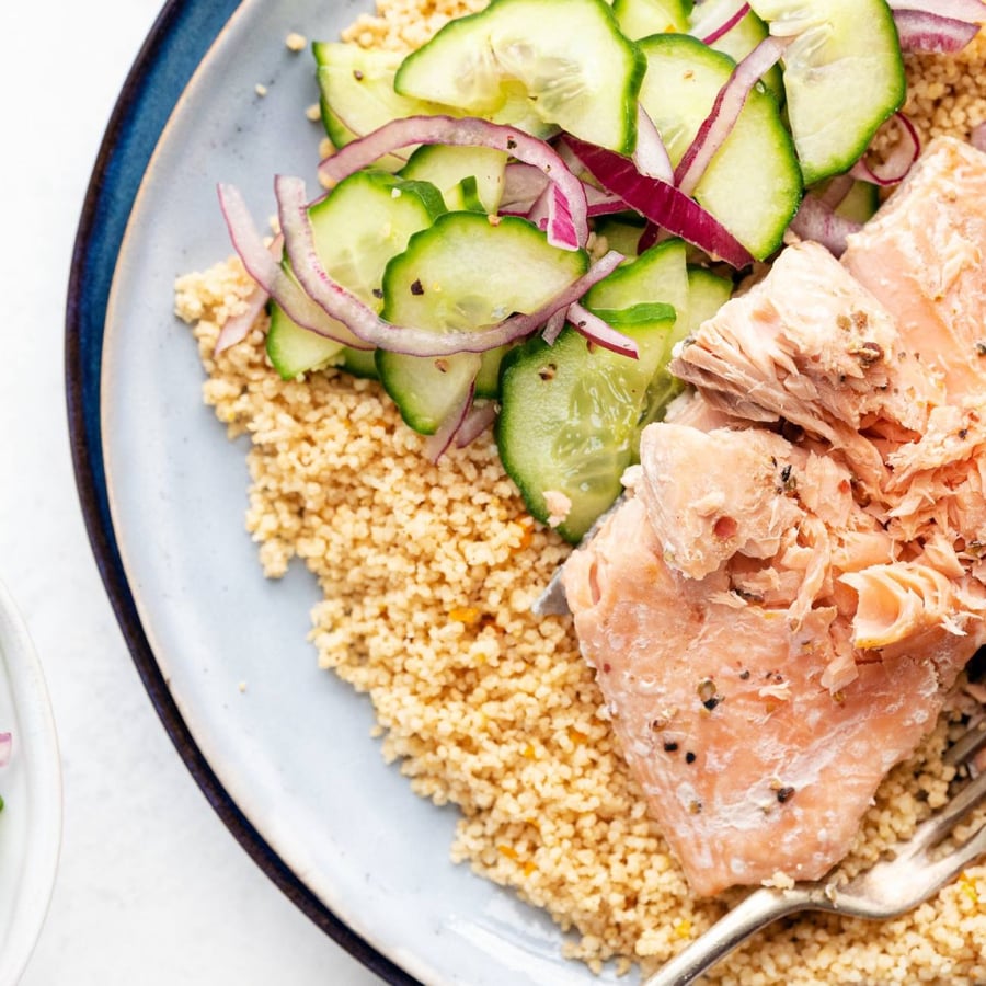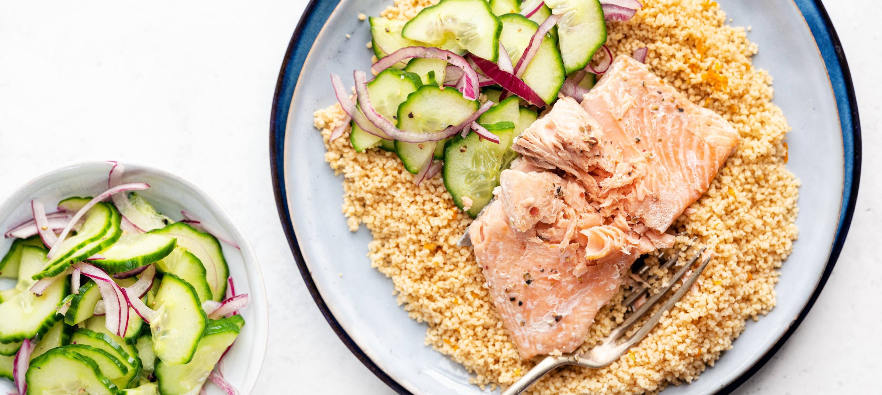 - 4In a smaller bowl, slice the cucumber into half-moons and the onion into thin slices, and drizzle with vinegar. Season with salt and pepper and let it sit for 10 minutes. Then mix with the couscous and serve with the salmon.