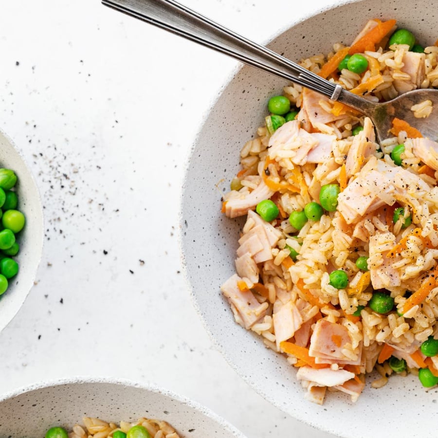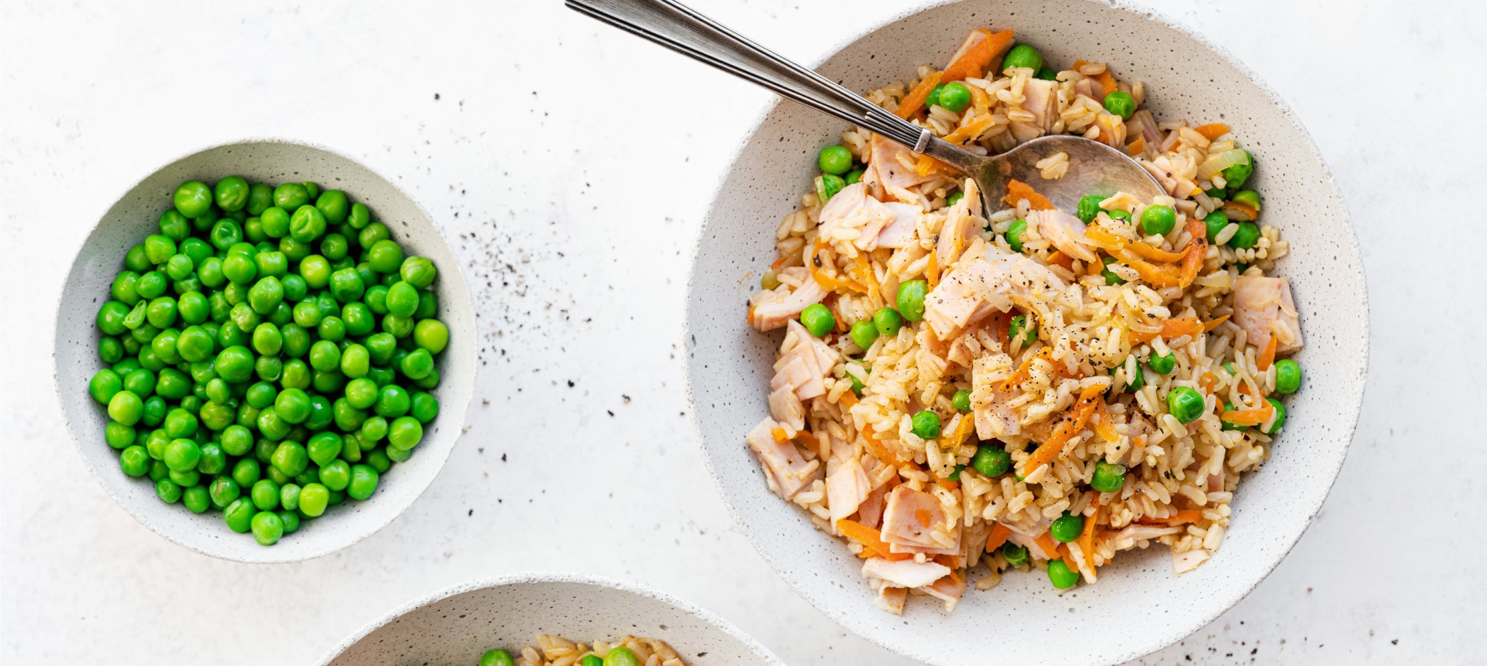 - 3After the rice is cooked, stir in the peas, ham, and carrot, reduce the heat to low, and let it cook for another 2 minutes.