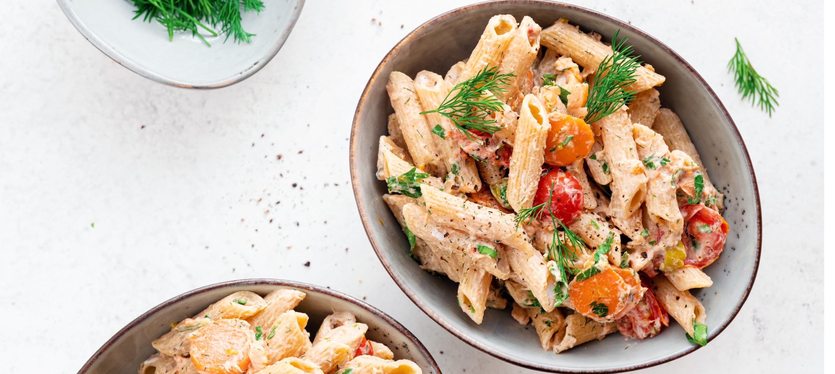 - 2Heat a large pot over medium heat and dry-fry (or with a little water) the carrot (about 3 minutes). Then add the tomatoes, olives, salt, pepper, dill, and vegetable broth, reduce the heat to low, and simmer (5–6 minutes). Then turn off the heat, stir in the yogurt, and add the salmon and cooked pasta.