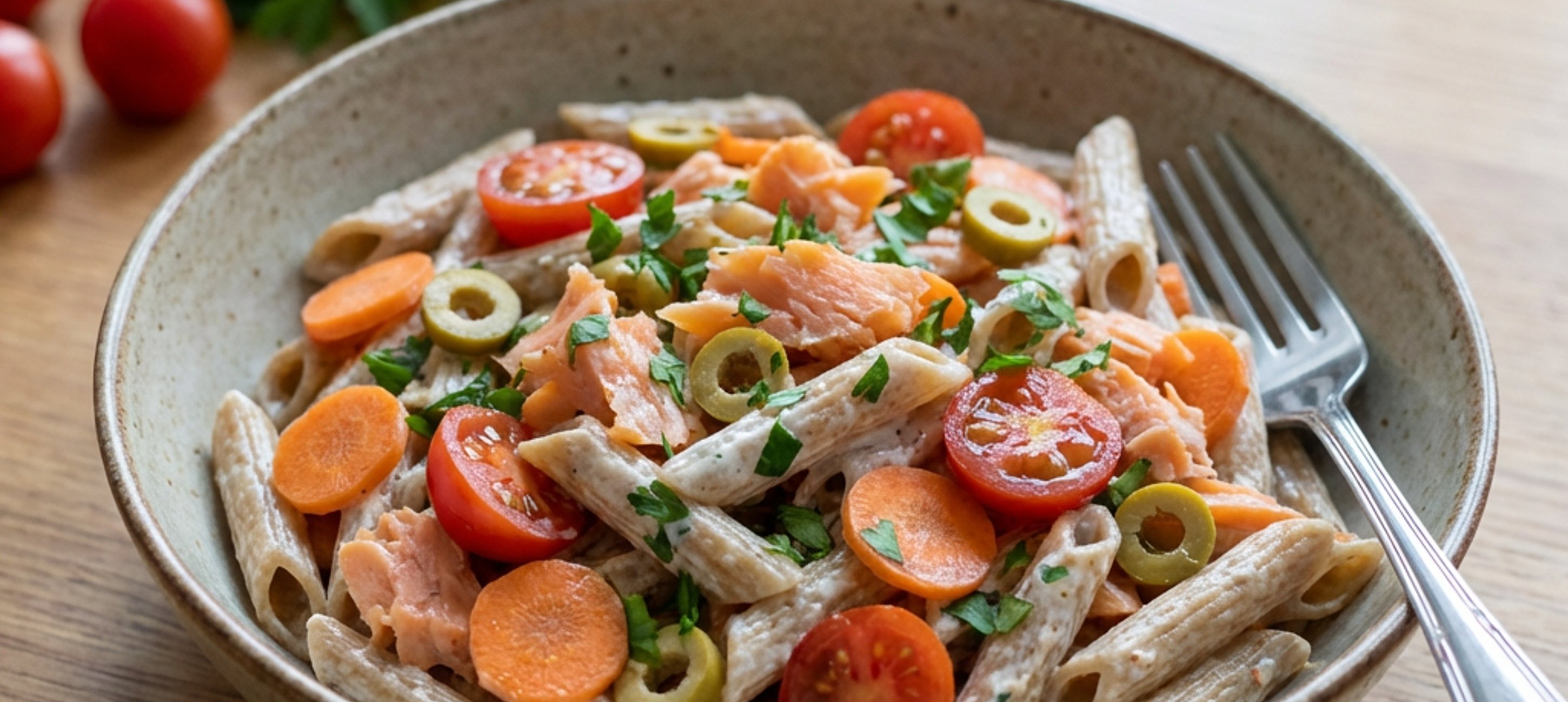 - 2Na středním plameni rozpalte větší hrnec a nasucho (nebo s trochou vody) v něm orestujte mrkev (cca 3 minuty). Poté přidejte rajčata, olivy, sůl, pepř, kopr a zeleninový vývar, plamen snižte na mírný stupeň a provařte (5–6 minut). Následně plamen vypněte, do směsi zamíchejte jogurt a přidejte lososa a uvařené těstoviny.