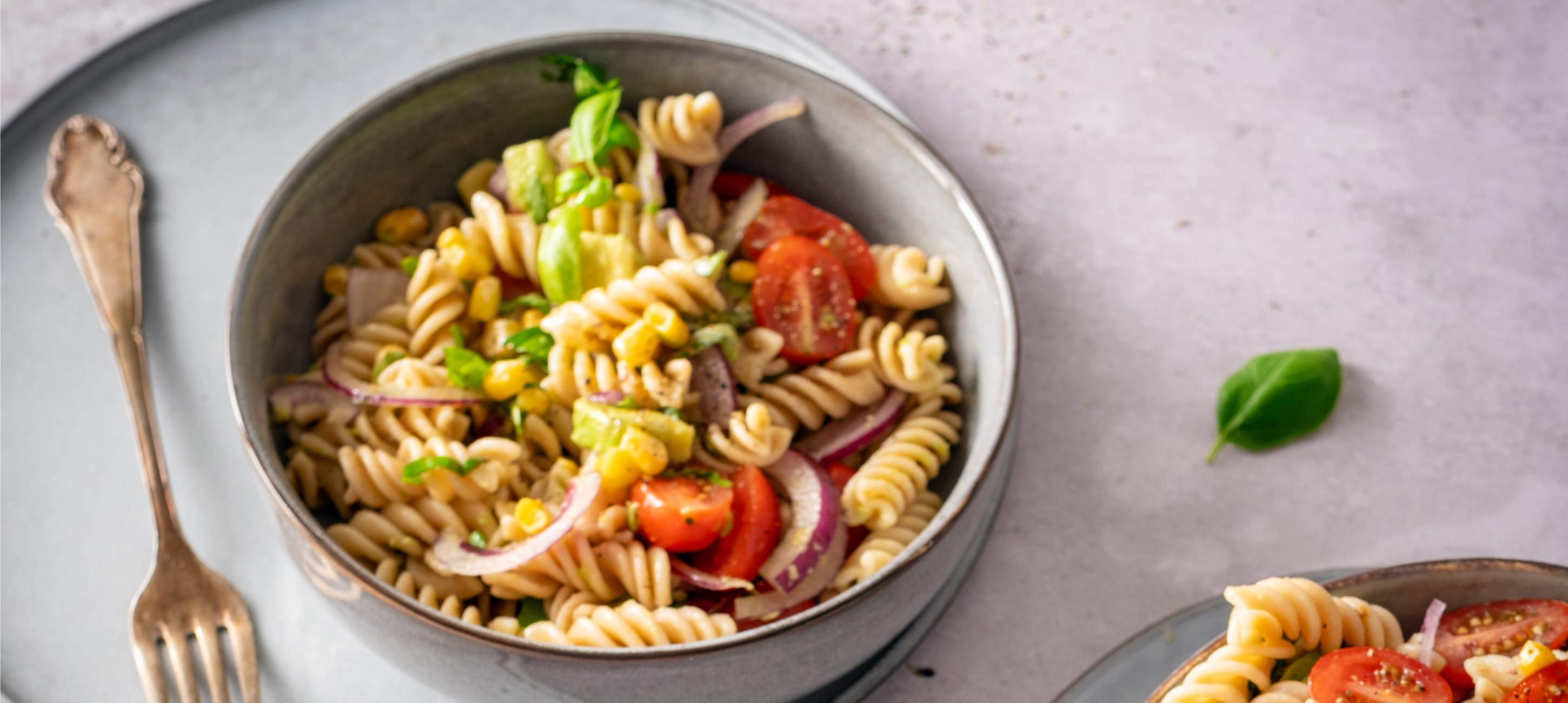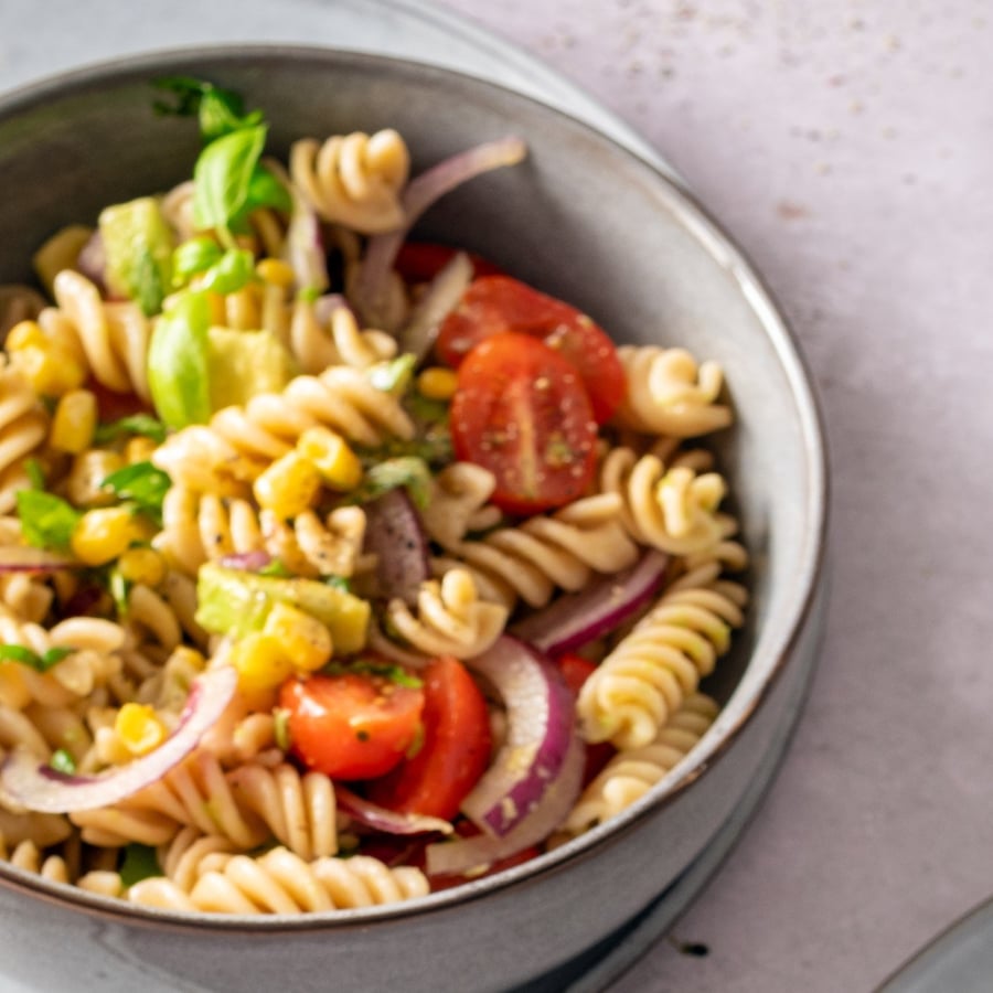 - 3Peel the avocado, remove the pit, cut it into small cubes, and place it in the bowl. Peel the onion, slice it thinly, and add it to the avocado. Wash the cherry tomatoes, cut them in half, and add them to the bowl along with the corn and other vegetables. Finally, roughly tear the basil into the bowl, add the drained cooked pasta, and mix everything together.