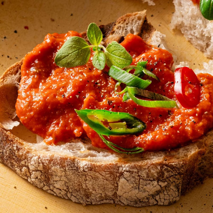 Serve on bread and garnish each portion with fresh basil, finely chopped fresh chili pepper, spring onion, and freshly ground pepper.