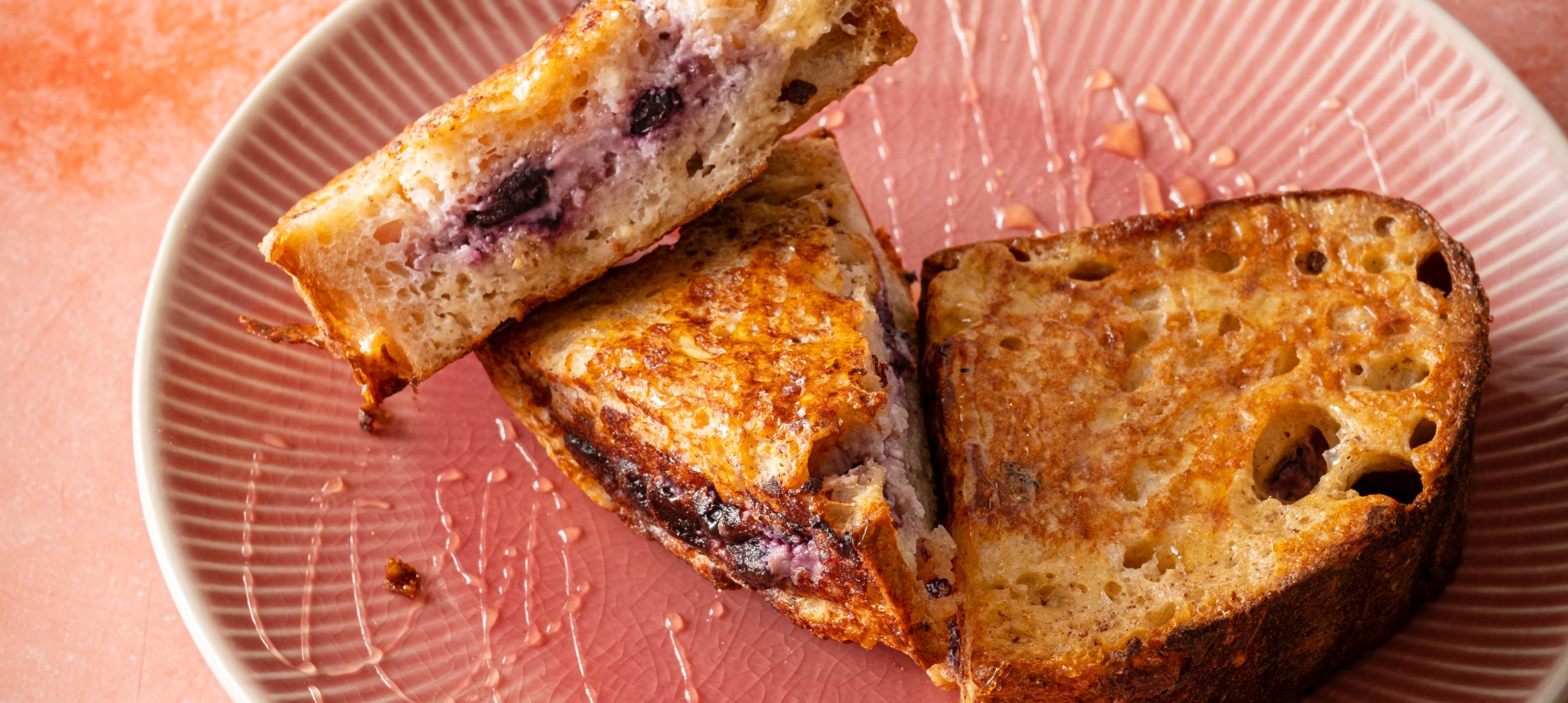 - 3Nasáklý chléb naplňte tvarohovou náplní.* Poté si vezměte pánev, dejte na ni máslo a rozehřejte ho na mírném až středním plameni. Jakmile se pánev rozehřeje a máslo rozpustí, dejte na ni naplněný chléb a opékejte ho na mírném až středním plameni 4–5 minut z každé strany dozlatova. Poté chléb sundejte z plamene a ihned podávejte. * Pokud vám náplň zbyde, naneste ji po opečení navrch jednotlivých toustů.