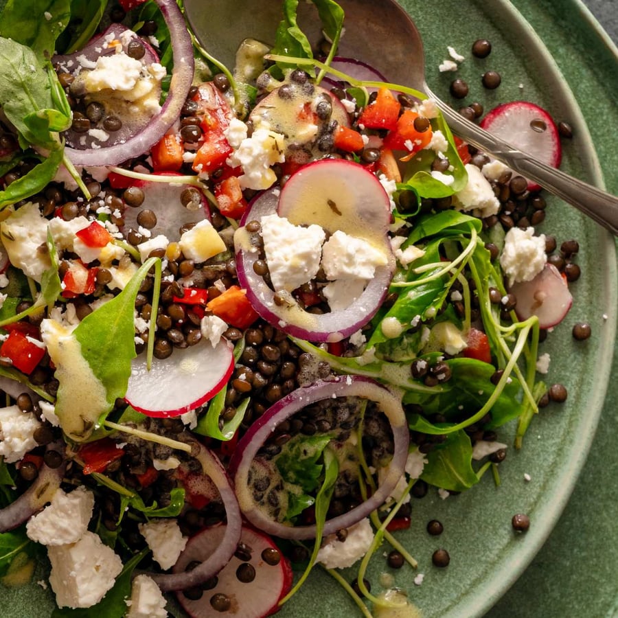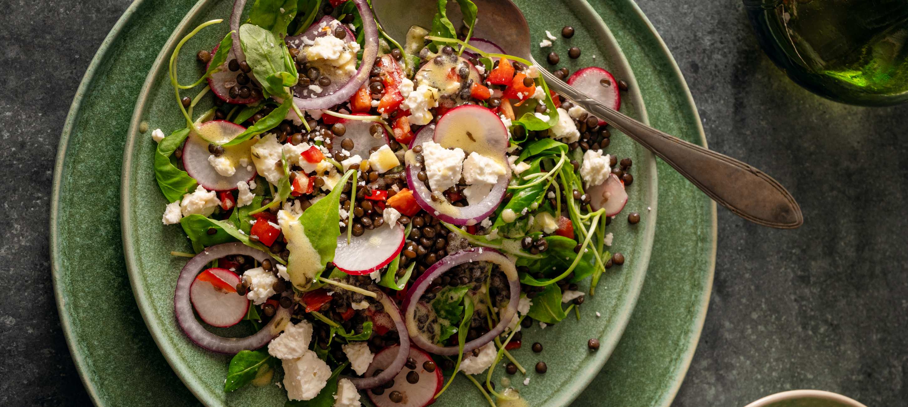 - 3Once the lentils are cooked, drain them, cool under cold water, and place in a larger bowl. Then add the chopped pepper, radishes, onion, wine vinegar, lemon juice, Dijon mustard, salt, and pepper, and mix everything thoroughly. Crumble the Balkan cheese into the resulting mixture, add arugula and 3 tablespoons of olive oil, and mix again (this time a bit more gently).