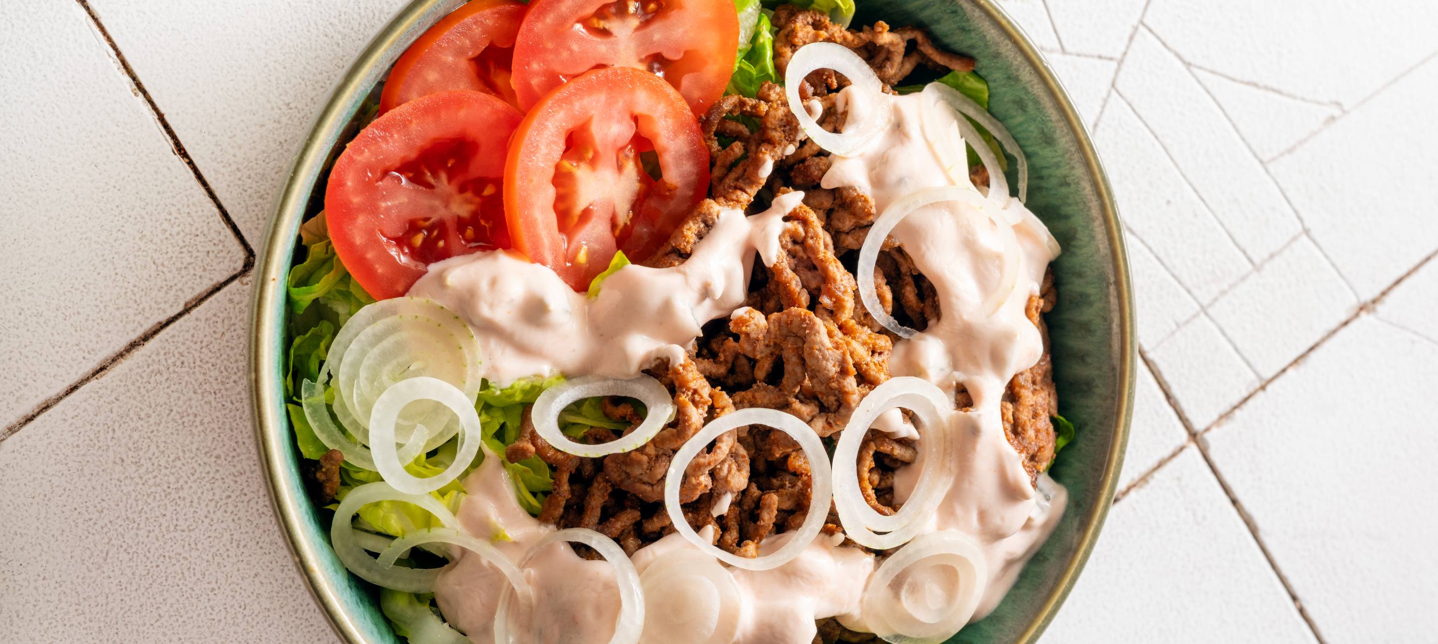 - 4Next, prepare 4 deep plates or large bowls and divide the chopped iceberg lettuce, onion, and tomatoes among them. Then divide the cooked meat into the bowls, pour the prepared dressing over each portion, and serve.