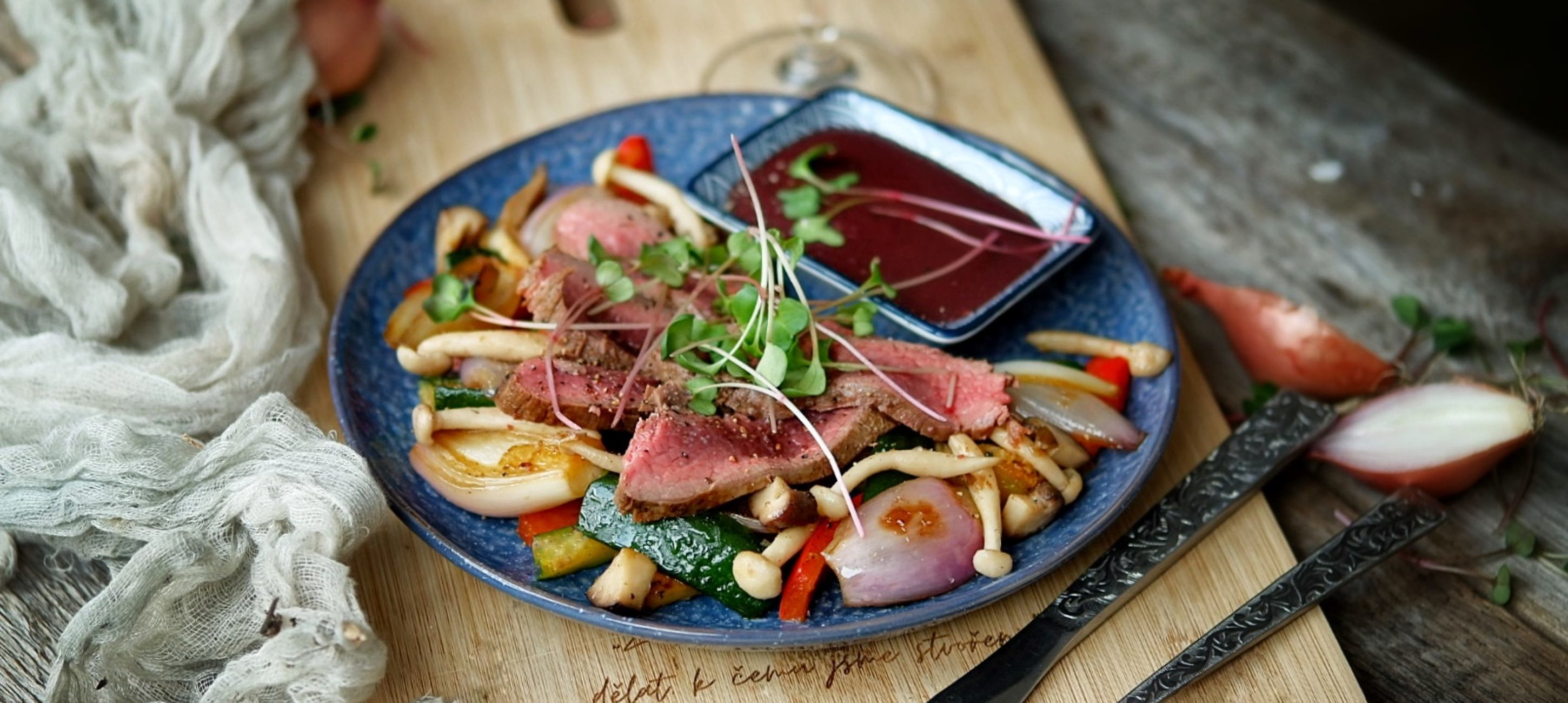 - 5Na talíř rozprostřeme zeleninu, houby, servírujeme s nakrájeným steakem a omáčkou. Dozdobíme microgreens.