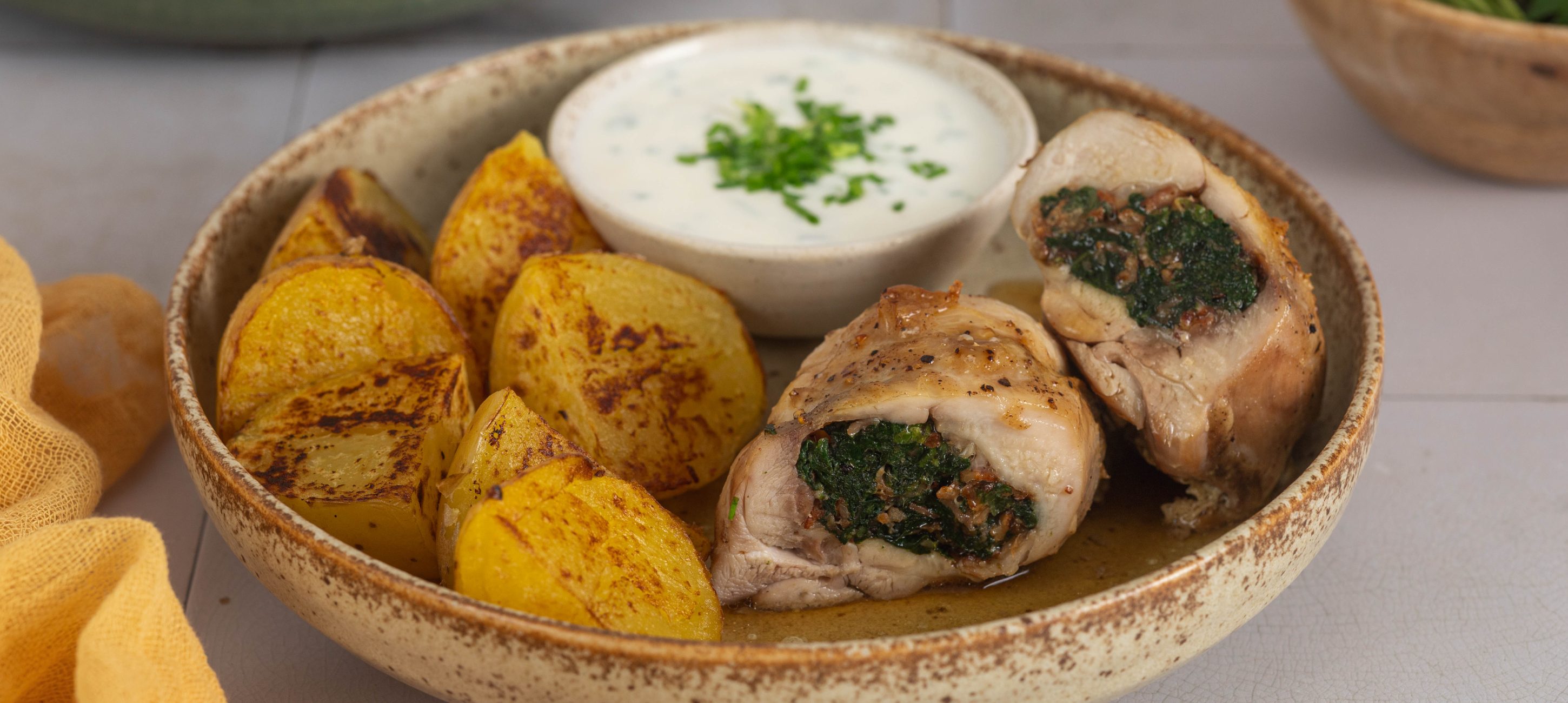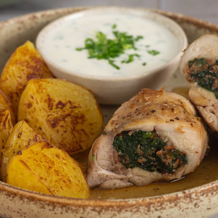 - 4Season the chicken with salt and lightly sprinkle with ground pepper. Place the chicken with the outer side down and put ¼ of the stuffing on the inner side (the side that was near the bone). Roll it up so that the stuffing stays inside and tie the roll with string or use toothpicks.