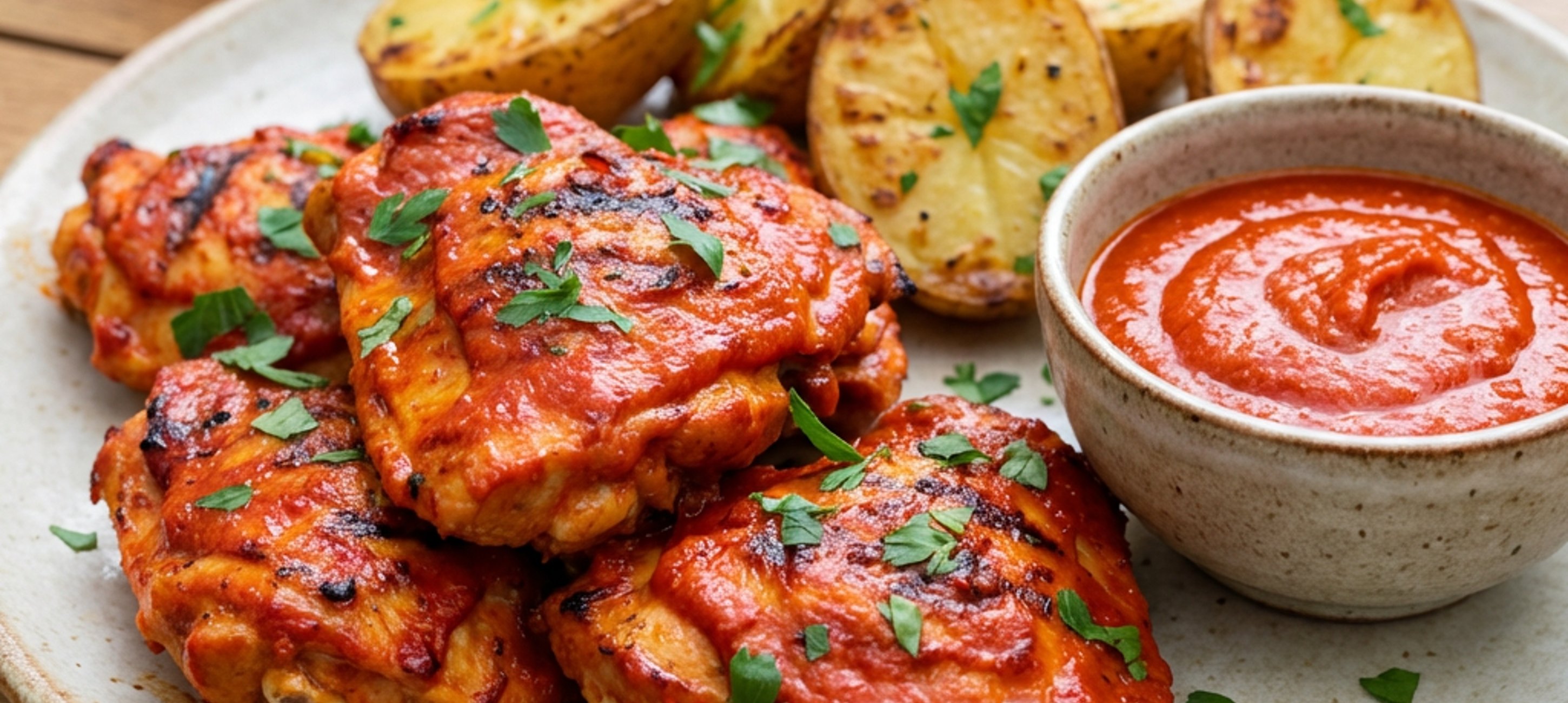 - 5Brambory položíme řeznou stranou dolů na gril a grilujeme, dokud nezískají zlatavou kůrku. Hotové maso i brambory servírujeme společně s dipem, případně dozdobíme petrželkou.