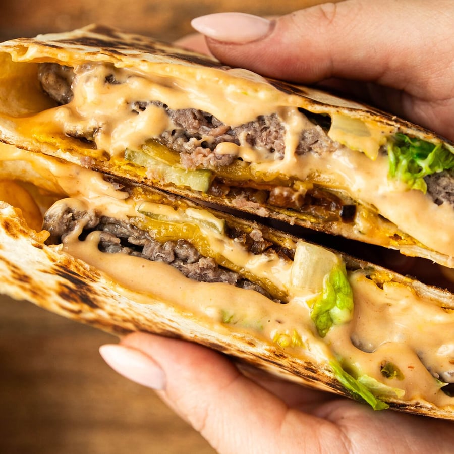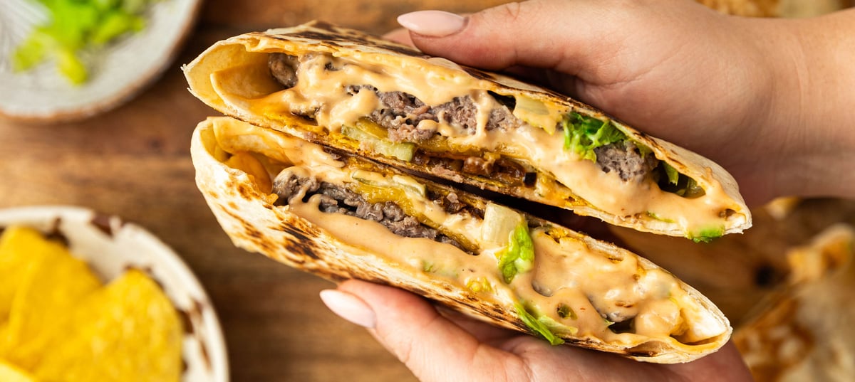 - 3Mezitím připravte dresink – jednoduše smíchejte veškeré suroviny a promíchejte dohladka. Větší tortillu pomažte dresinkem, okraje nechte cca 3 cm volné, přidejte pokrájený římský salát a placku hotového masa. Poklaďte ho plátky sýru, nakrájenou kyselou okurkou, zkaramelizovanou cibulkou a nachos. Menší tortillu také potřete dresinkem a položte ji pomazanou stranou na nachos.