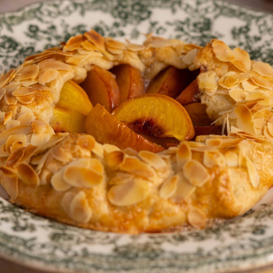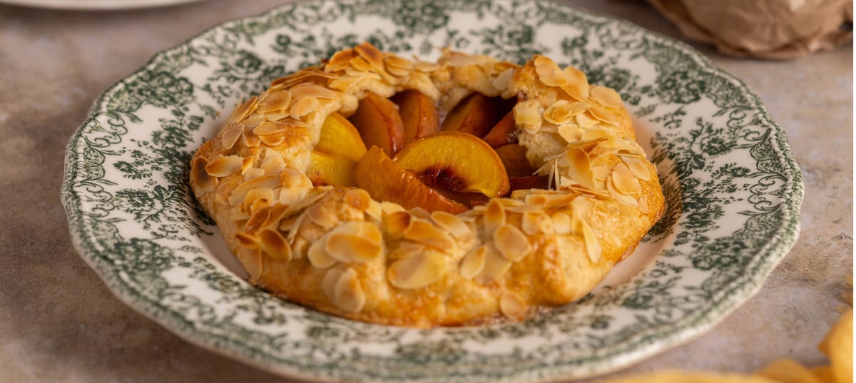 - 5Těsto poklademe broskvemi a necháváme přibližně 4 cm od kraje volné. Okraje těsta přehneme přes náplň, potřeme je rozšlehaným bílkem a posypeme plátky mandlí.