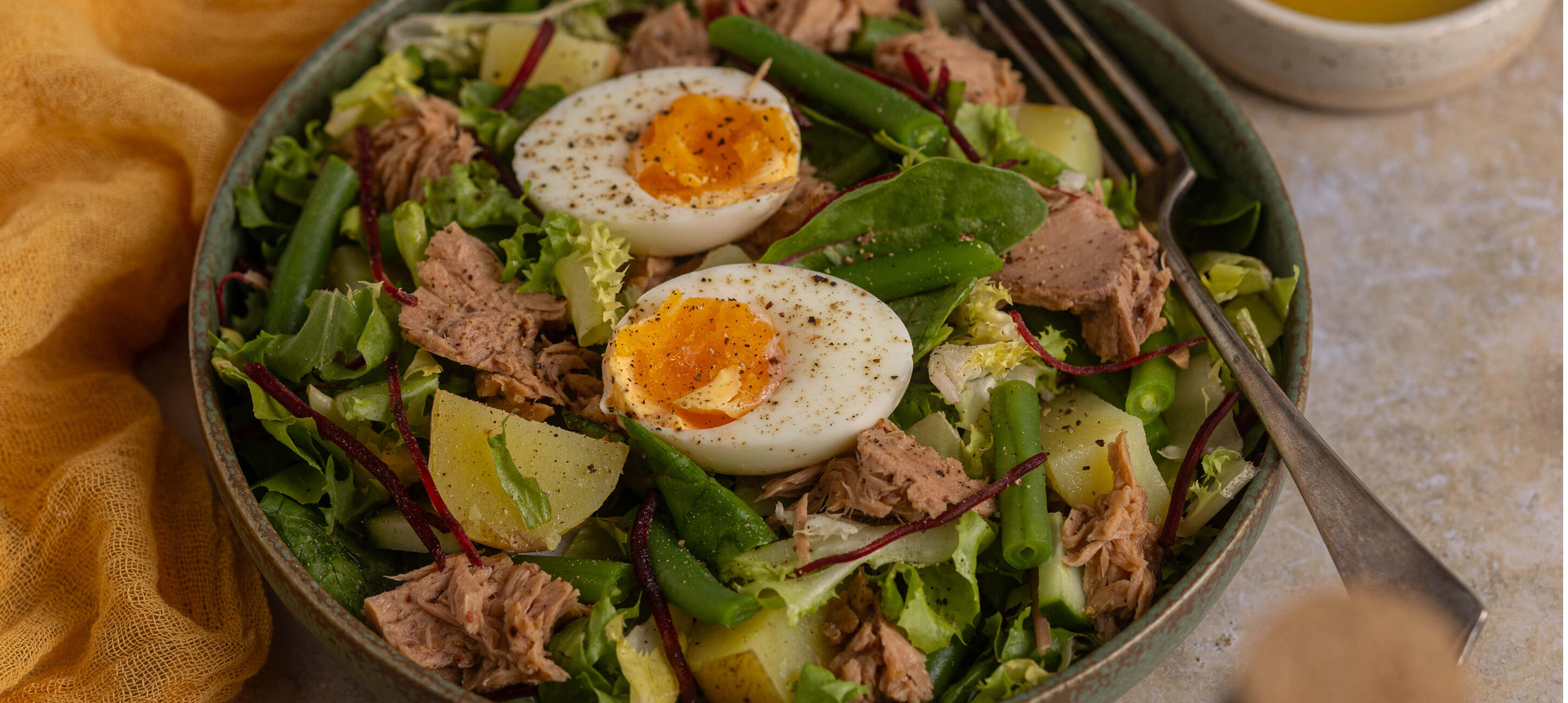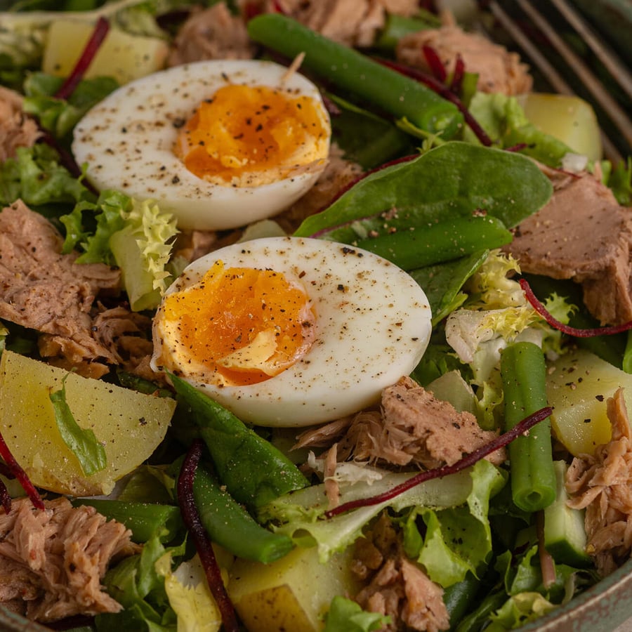 - 5Do misky nebo talíře vložíme salát, poklademe brambory, fazolky, okurku, tuňáka a vejce. Osolíme. Přidáme zálivku a podáváme.
