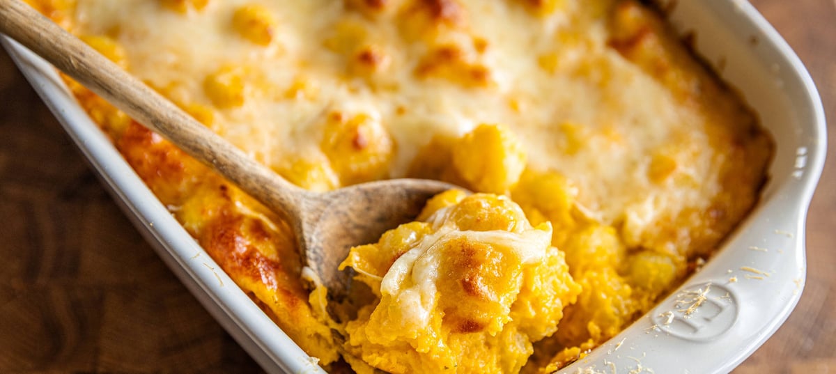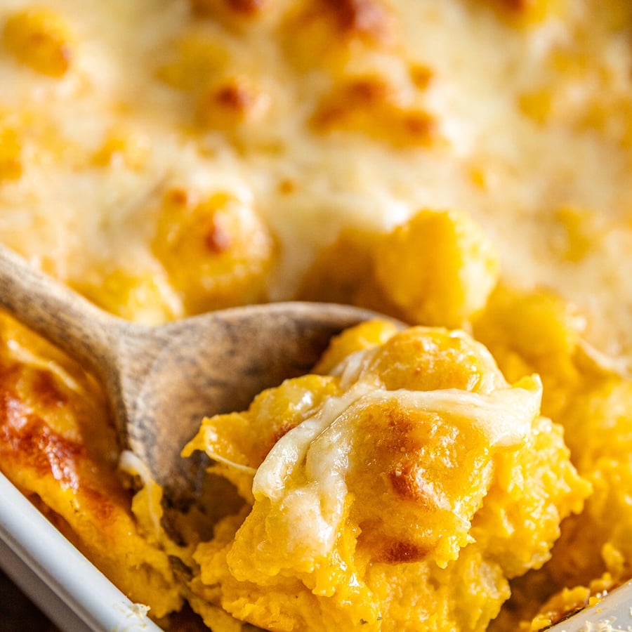 - 3Do zapékací misky nasypte syrové gnocchi, přidejte dýňovou omáčku, promíchejte a uhlaďte. Vršek posypte strouhanou mozzarellou a najemno nastrouhaným parmezánem a vložte do rozpálené trouby na 25 minut či dokud nebudou gnocchi kompletně hotové a vršek zlatavý.