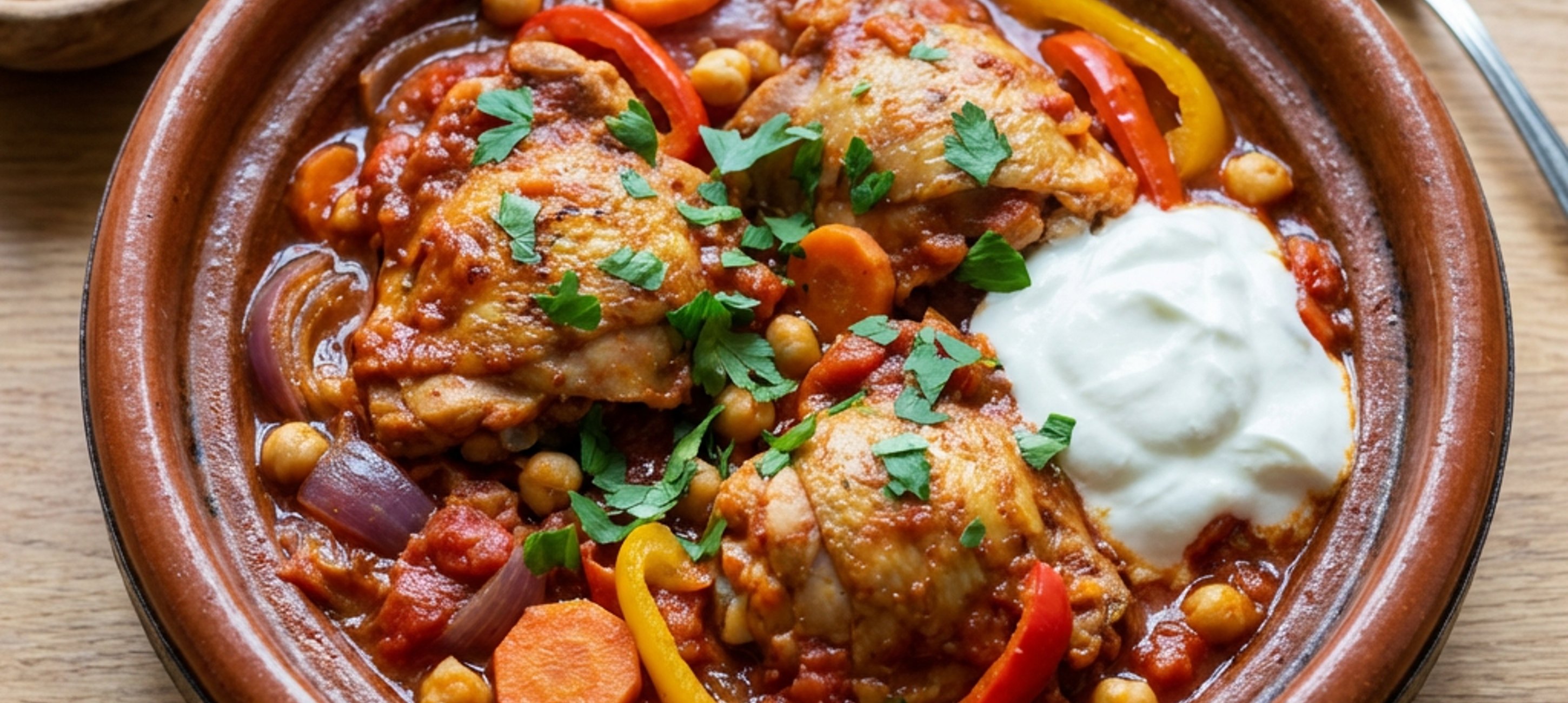 - 3Na dně hrnce na tajine nebo tlustostěnné pánve rozpálíme olej a zprudka orestujeme maso ze všech stran. Dáme stranou a orestujeme zeleninu. Poté přidáme další koření a minutu ještě restujeme. Přidáme harissa pastu, vývar, krájená rajčata a osolíme. Promícháme a do pánve vrátíme maso. Přikryjeme a na nízkém plameni vaříme jednu hodinu. Před koncem přidáme cizrnu. Dochutíme čerstvě mletým pepřem a sekanou petrželkou.
