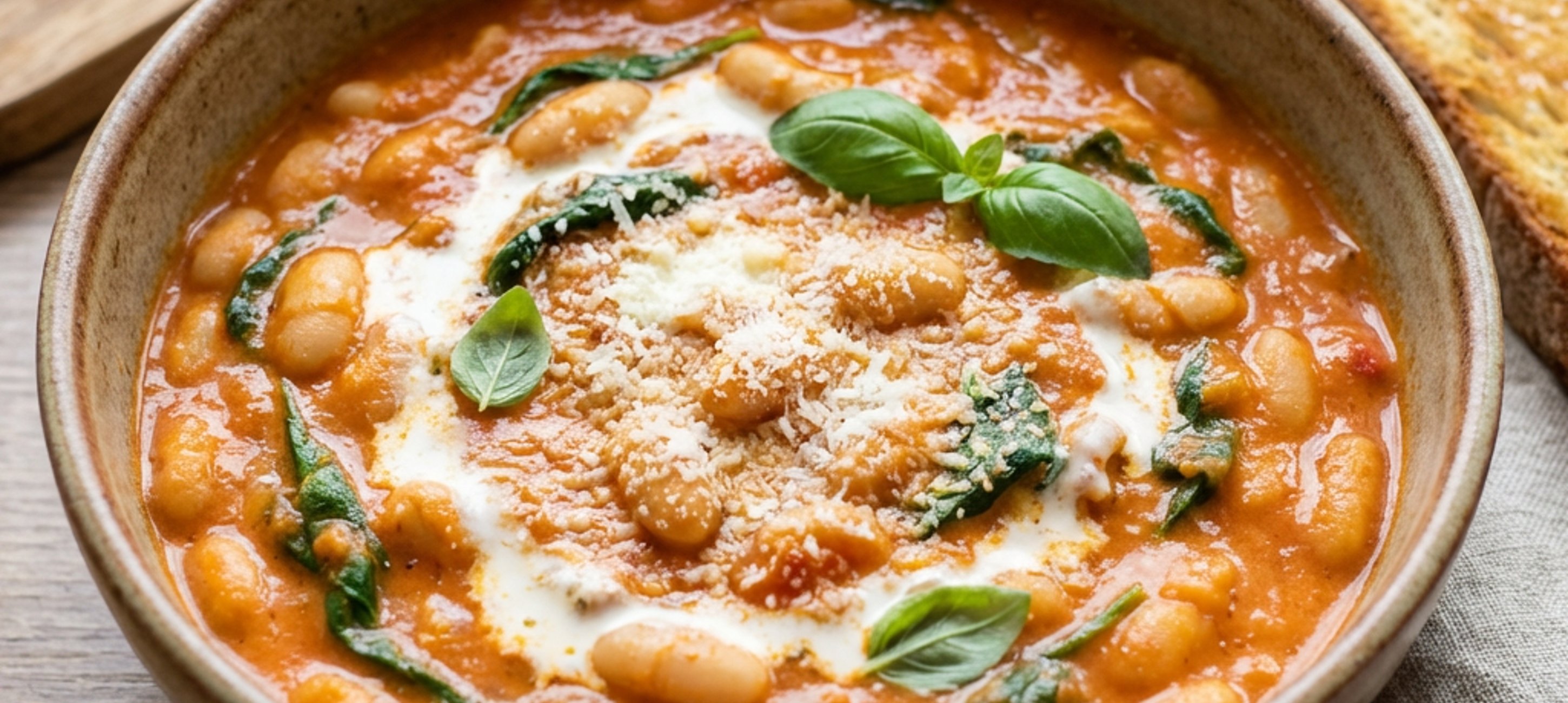 - 2Nechte vařit, dokud není směs hustá, trvá to cca 10 minut. Osolte (se solí opatrně, většina ingrediencí v pánvi je již slaná), opepřete, přidejte pokrájenou bazalku a špenát. Promíchejte, a nakonec zjemněte smetanou a parmazánem. Podávejte s opečeným chlebem. Dobrou chuť!