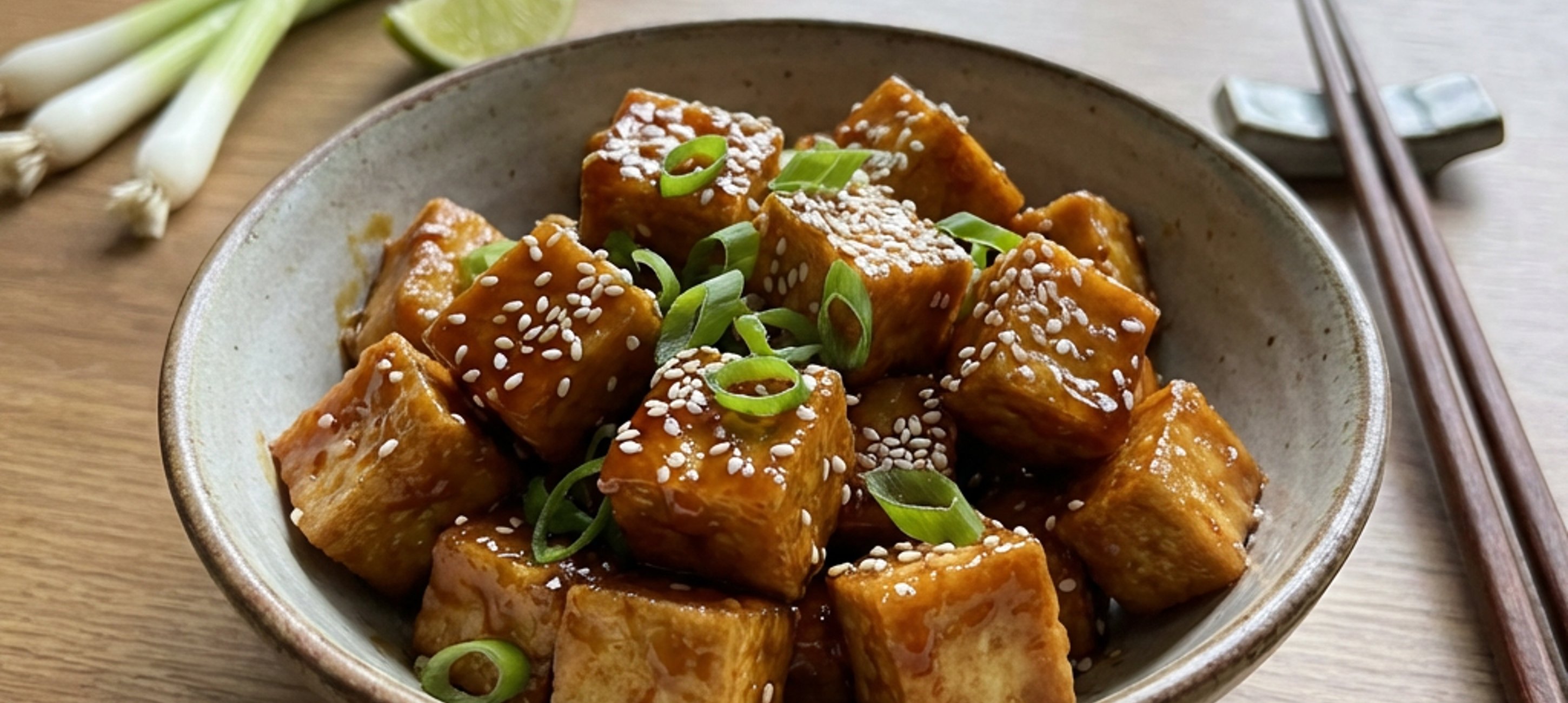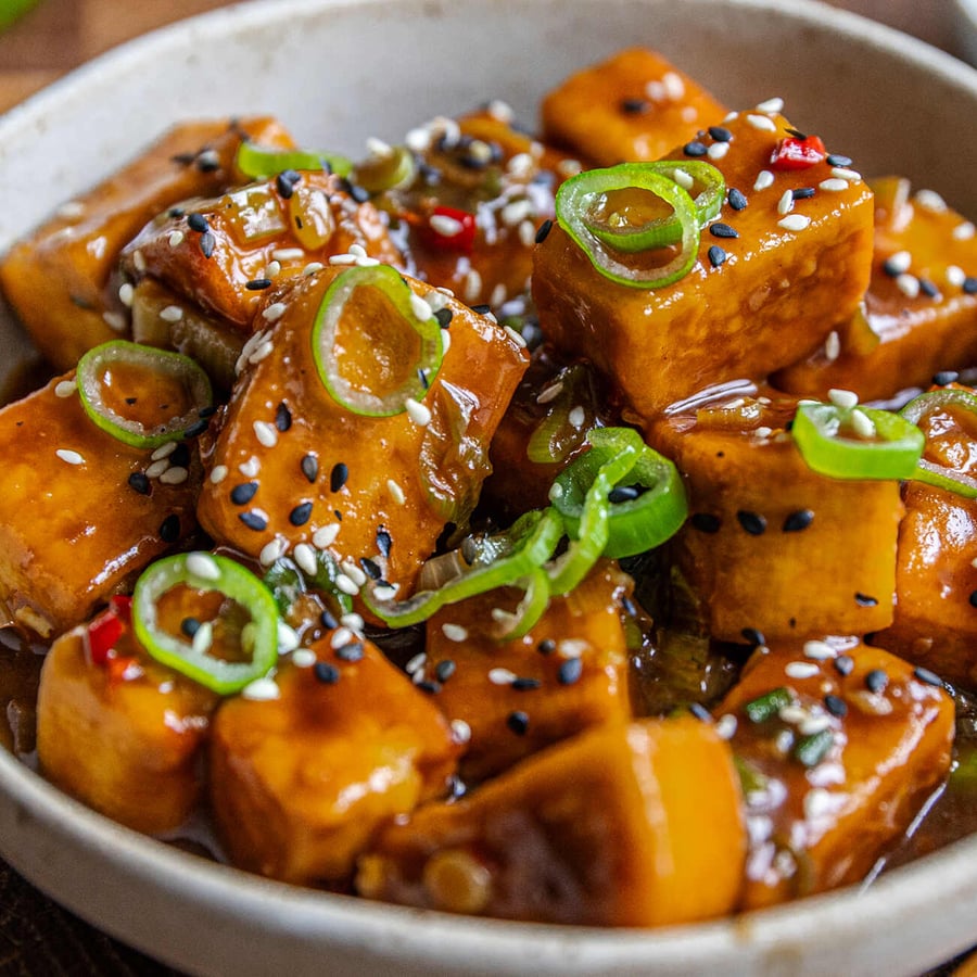 - 3Jakmile je tofu dokonale opečené, odeberte ho z pánve, a přidejte do ní pokrájenou jarní cibulku. Za občasného promíchání ji orestujte, následně přisypte zpátky křupavé tofu. Nakonec zalijte omáčkou a minutu prohřejte, dokud omáčka nezhoustne a neobalí tofu. Podávejte posypané jarní cibulkou a sezamem.