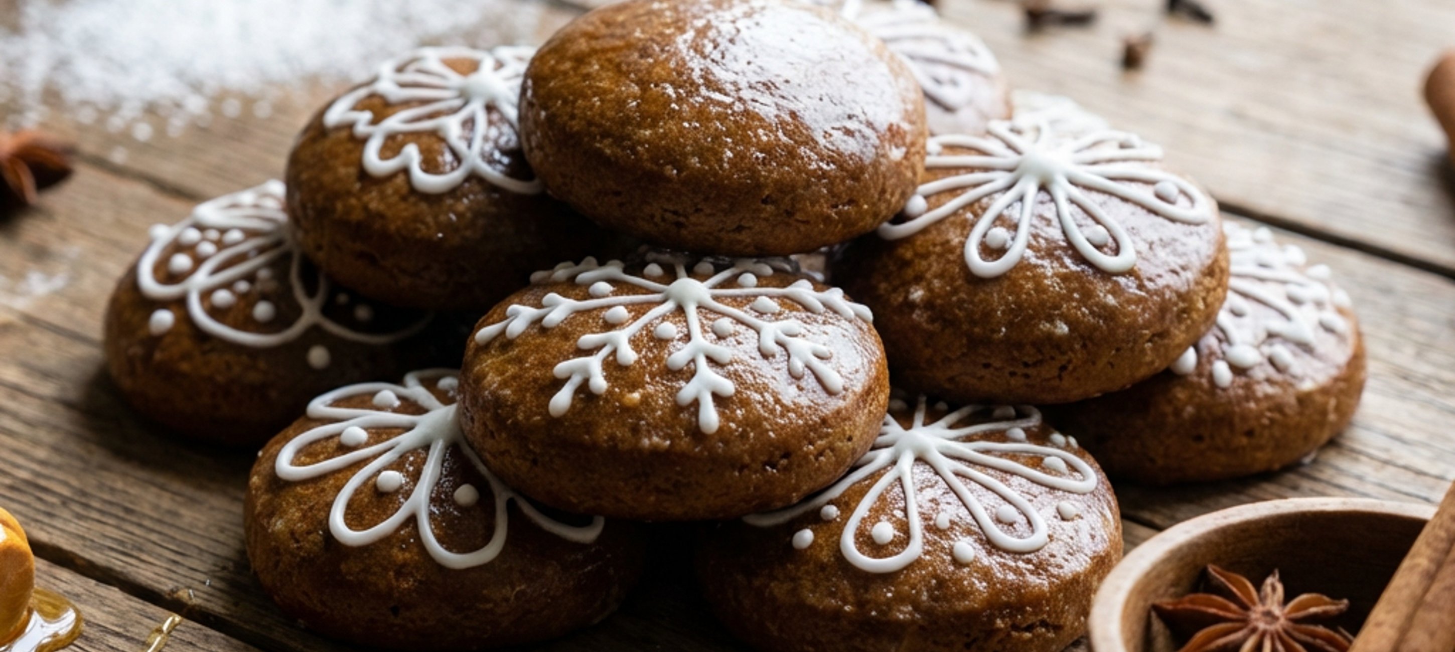 - 3Jakmile jsou perníčky vychladlé, můžete připravit polevu. Bílek lehce prošlehejte vidličkou, poté k němu prosejte moučkový cukr a škrob a promíchejte do husté a lesklé polevy, která by měla být hustá, ale stále stékat ze lžičky. Pokud je až moc hustá, přidejte citron, pokud naopak řídká, přidejte ještě trochu cukru. Trochu polevy přesuňte do cukrářského sáčku, odstřihněte malý růžek a tence ozdobte jednotlivé perníčky dle své fantazie. Dobrou chuť!