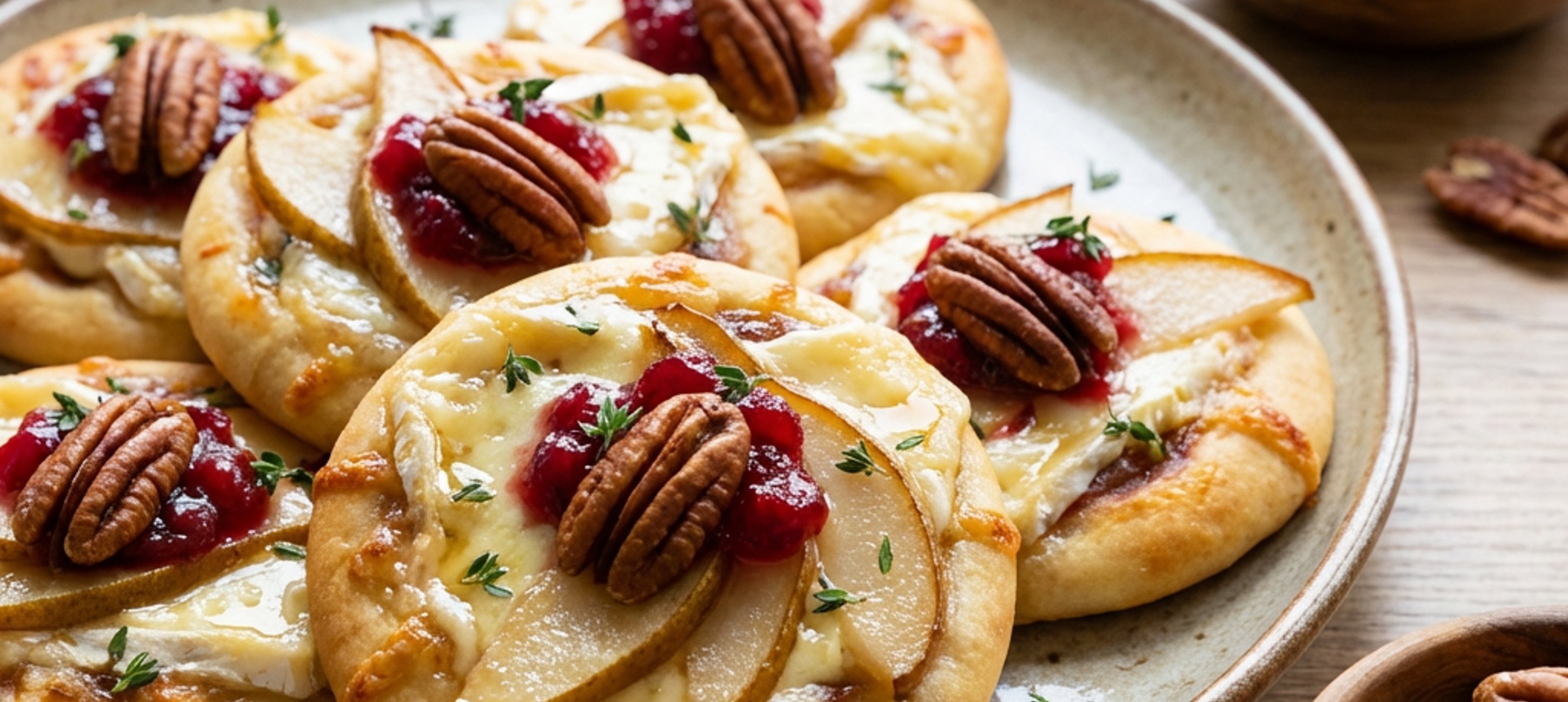 - 3Na předpečené těsto dáme plátky Brie, hrušku, pekanový ořech a dáme péct ještě na další 5-7 minut. Servírujeme s brusinkovým kompotem, brusinkami a čerstvým tymiánem.
