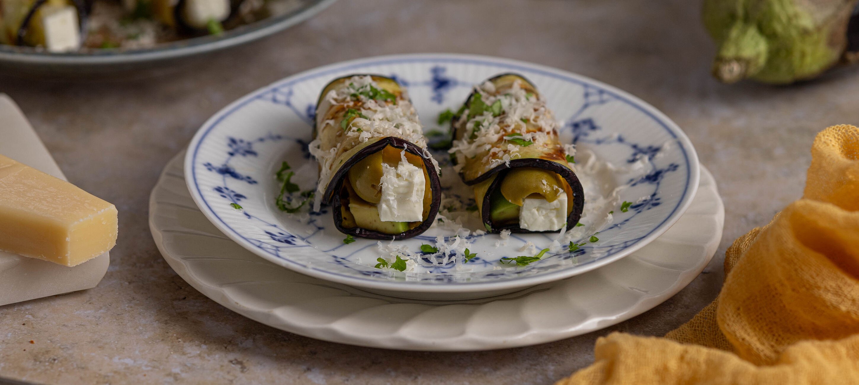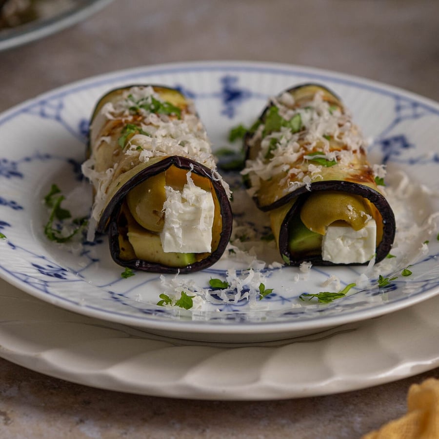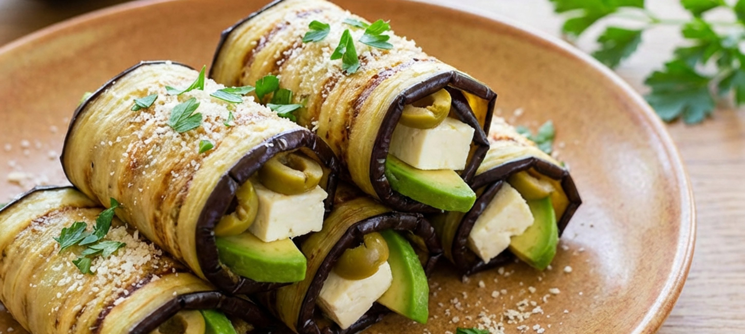 - 4Na každý plátek lilku položíme sýr, plátek avokáda a půlky oliv. Zavineme do rolky. Hotové rolky posypeme strouhaným parmazánem a sekanou petrželkou. Můžeme takto podávat nebo lze ještě na 2 minuty zapéct pod grilem. Podáváme samostatně jako předkrm nebo s přílohou jako hlavní chod.