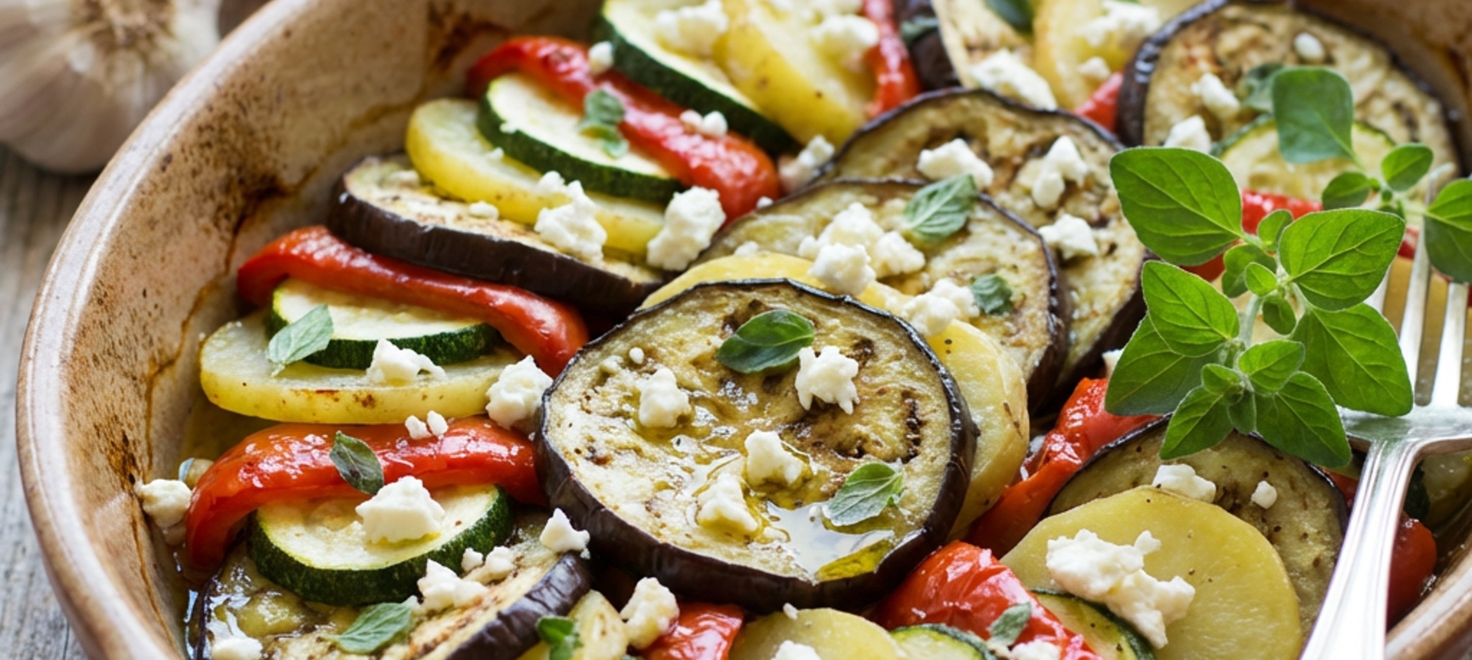 - 3Zeleninu naaranžujte do zapékací mísy po vrstvách nebo do řad a přelijte zbytkem marinády. Přelijte 2 lžícemi passaty/rajčatové omáčky a do rohu zapékací misky vlijte asi ⅓ hrnku vody, nepřelévejte přímo přes zeleninu. Pečte 45 až 60 minut, dokud zelenina nezačne zlátnout a nezměkne, poté nechte odstát asi 15 minut a podávejte se sýrem Feta.