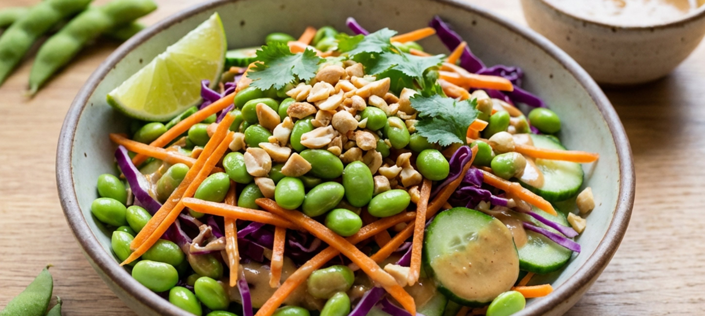 - 3V hluboké míse promíchejte edamame, mrkev, zelí a okurku. Zalijte dresinkem a dobře promíchejte. Nakonec posypte nahrubo nasekanými arašídy a koriandrem a podávejte.