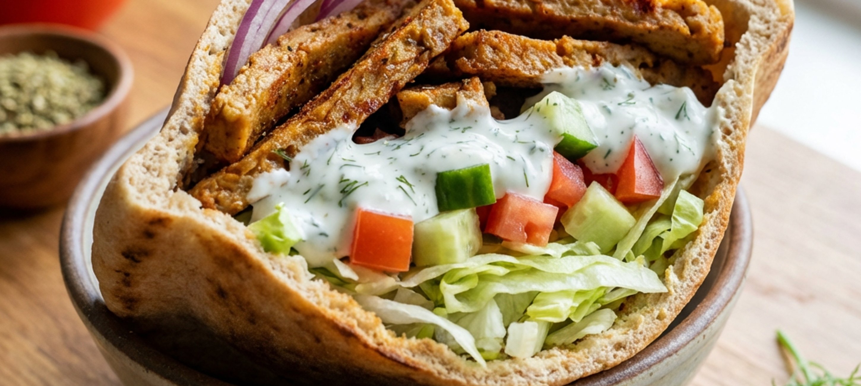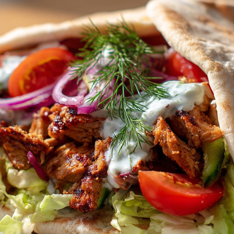 - 3V samostatné misce smíchejte všechny suroviny na dip a dobře promíchejte. Do teplých pit rozetřete vrstvu dipu, přidejte salát, rajče, okurku a nakonec křupavé gyros nudličky. Zabalte a podávejte ještě teplé.
