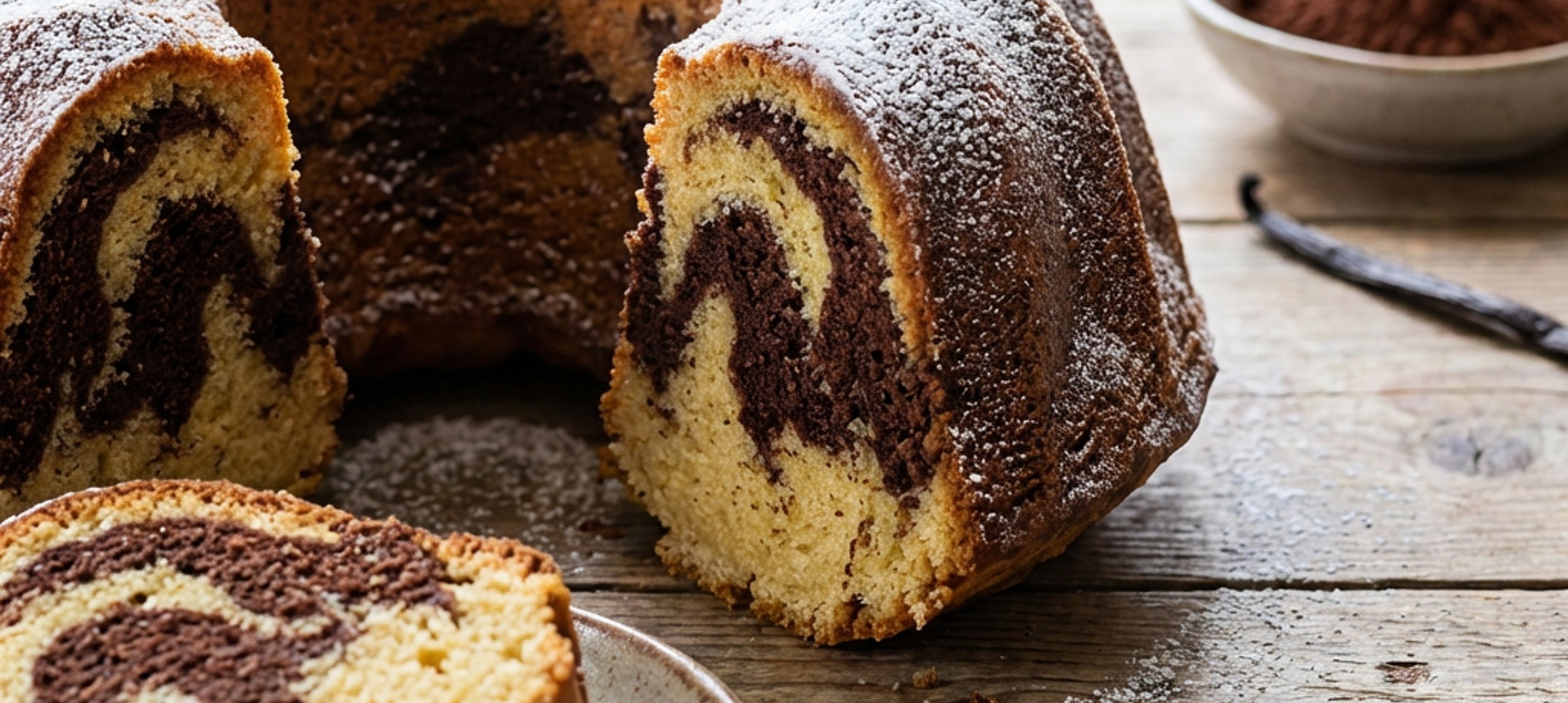 - 3Polovinu těsta přelijte do jiné misky a vmíchejte kakao a 2 lžíce mléka navíc. Do připravené formy dávejte střídavě světlé a tmavé těsto po vrstvách a nakonec nožem jemně promíchejte, aby se vytvořil mramorový vzor. Bábovku vložte do trouby a pečte 40-50 minut, dokud není špejle po vytažení čistá.