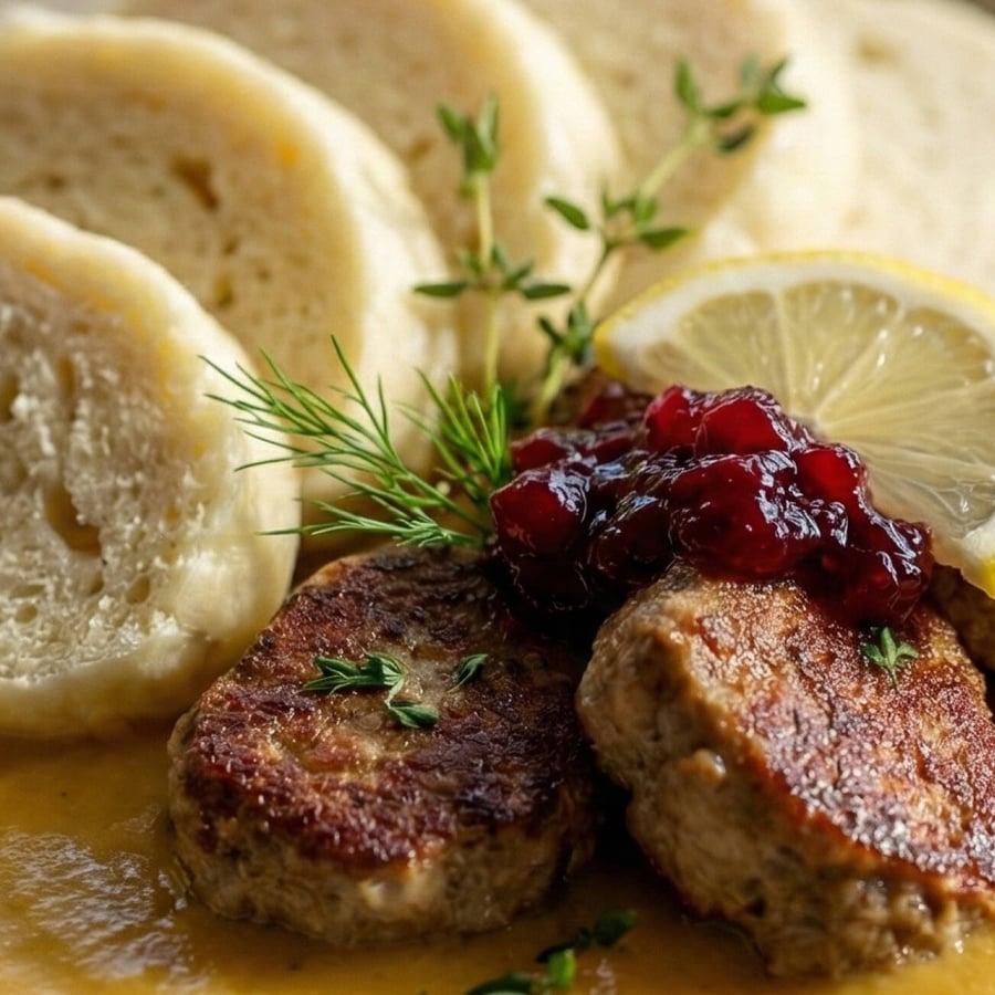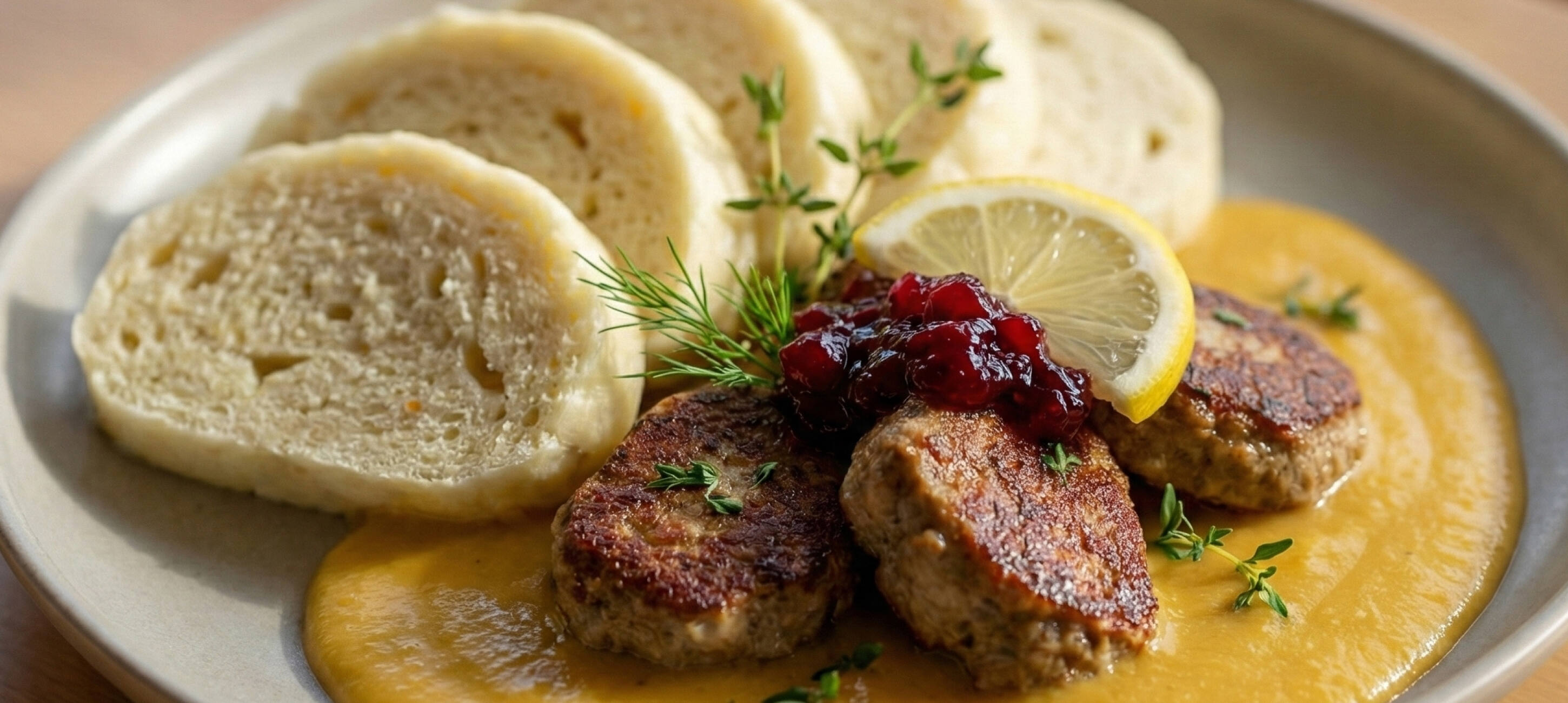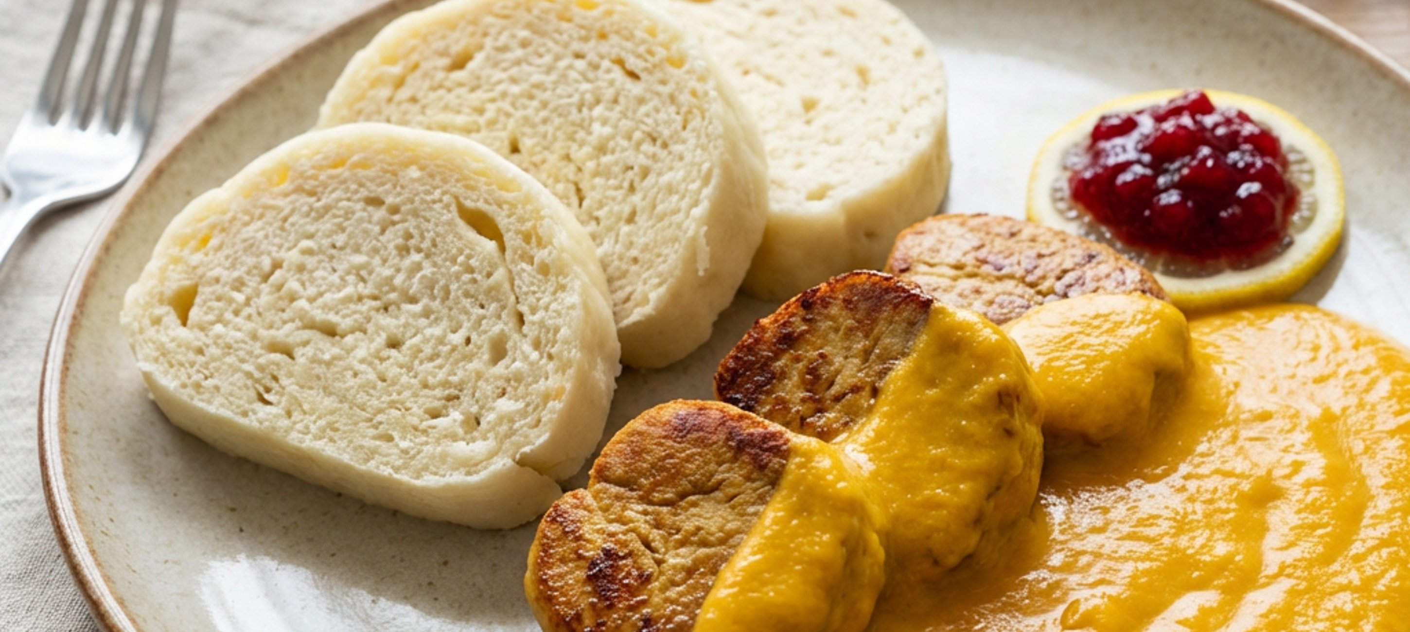 - 4Servírujte. Na talíř dejte plátky veganských knedlíků, zalijte hojným množstvím krémové svíčkové omáčky a navrch klaďte opečené veganské „maso“. Volitelně podávejte s plátkem citronu nebo brusinkovou omáčkou.