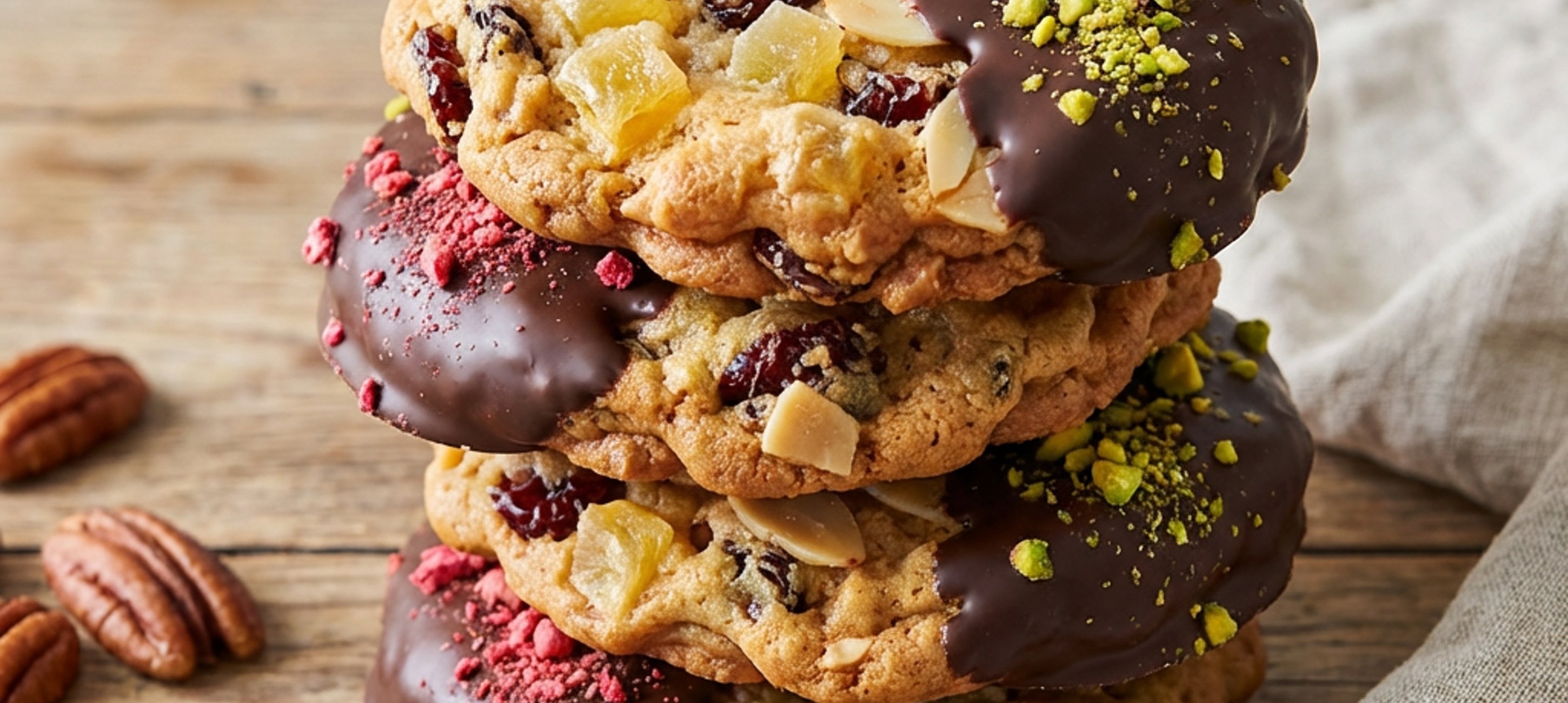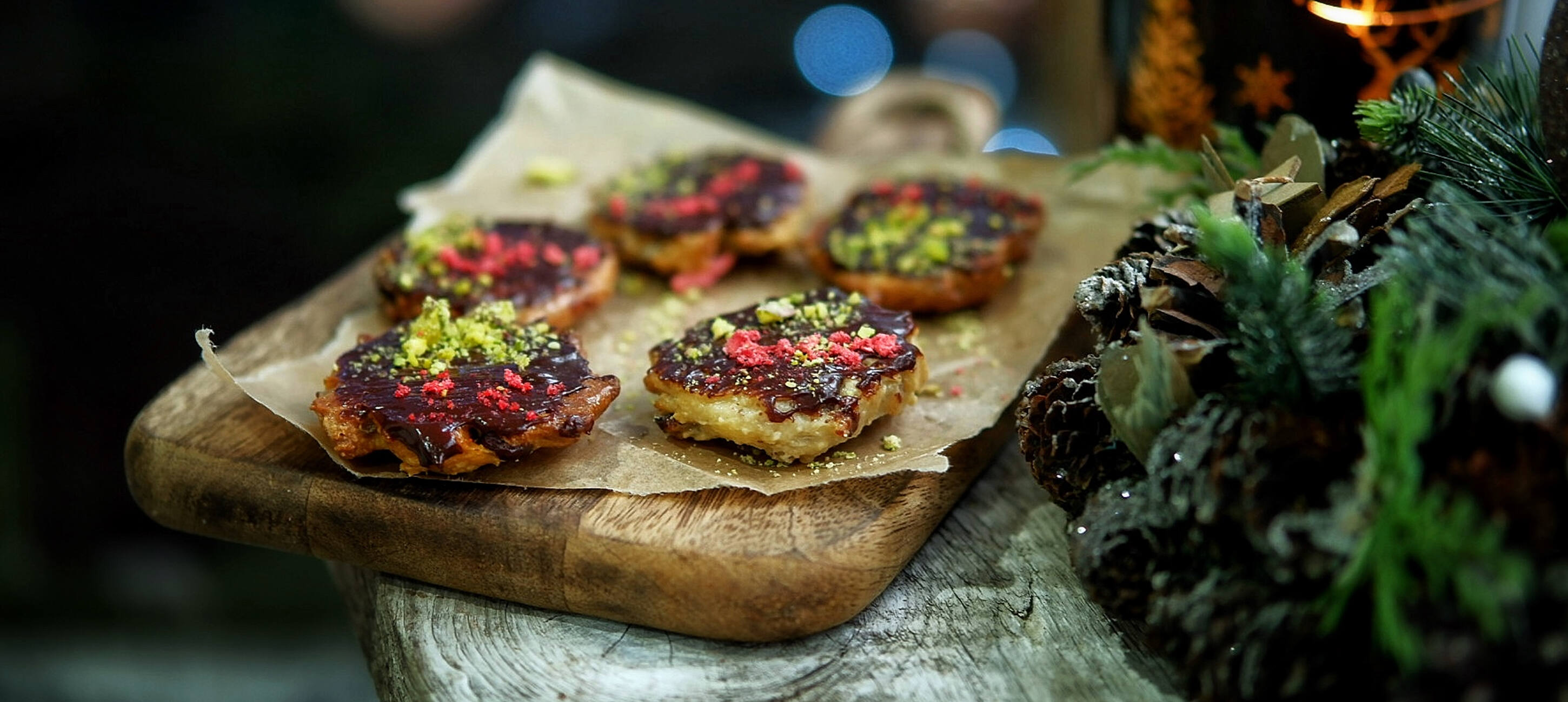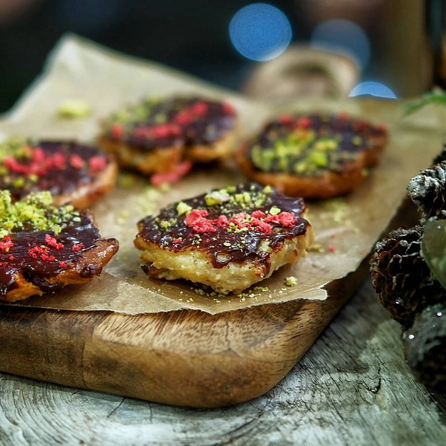 - 3V hrnci si rozpustíme čokoládu s trochou mléka. Marokánky potřeme z jedné strany čokoládou a posypeme drceným prachem z jahod či malin a nadrcenými pistáciemi.