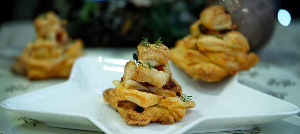 - 1Listové těsto rozdělíme na 2 stejně velké části a rozválím. Každou část nakrájíme na čtverce. Z 300 g těsta vznikne 4x 7 čtverců. Čtverce jdou od největšího po nejmenší, aby se dal vrstvit stromek. Na každou část, kromě poslední dáme kousek prosciutta, sýru a pesta. Poskládáme na sebe vždy dva čtverce kolmo na sebe a zpevníme špejlí.