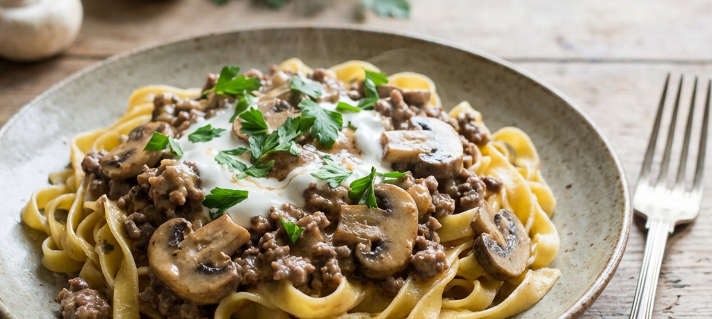- 2Na pánev nalijeme lžíci oleje a rozpálíme ji. Usmažíme cibuli a česnek do sklovata. Přidáme žampiony a dál restujeme. Jakmile žampiony zmenší velikost po cca 3 - 5 minutách, přidáme mleté maso. Plochou vařečkou jej rozdělíme na co nejmenší kousky. Restujeme dál cca 5-10 minut dokud se neodpaří tekutina, kterou maso pustí. Přidáme worcesterovou omáčku a hořčici, minutu opékáme a zalijeme vývarem. Přidáme sůl a mletý pepř. Vaříme na mírném ohni s poklicí 30 minut. Občas zkontrolujeme a promícháme. V misce smícháme 2 lžíce vody s kukuřičným škrobem a přidáme do omáčky. Mícháme, dokud omáčka nezhoustne. Na závěr přidáme zakysanou smetanu.