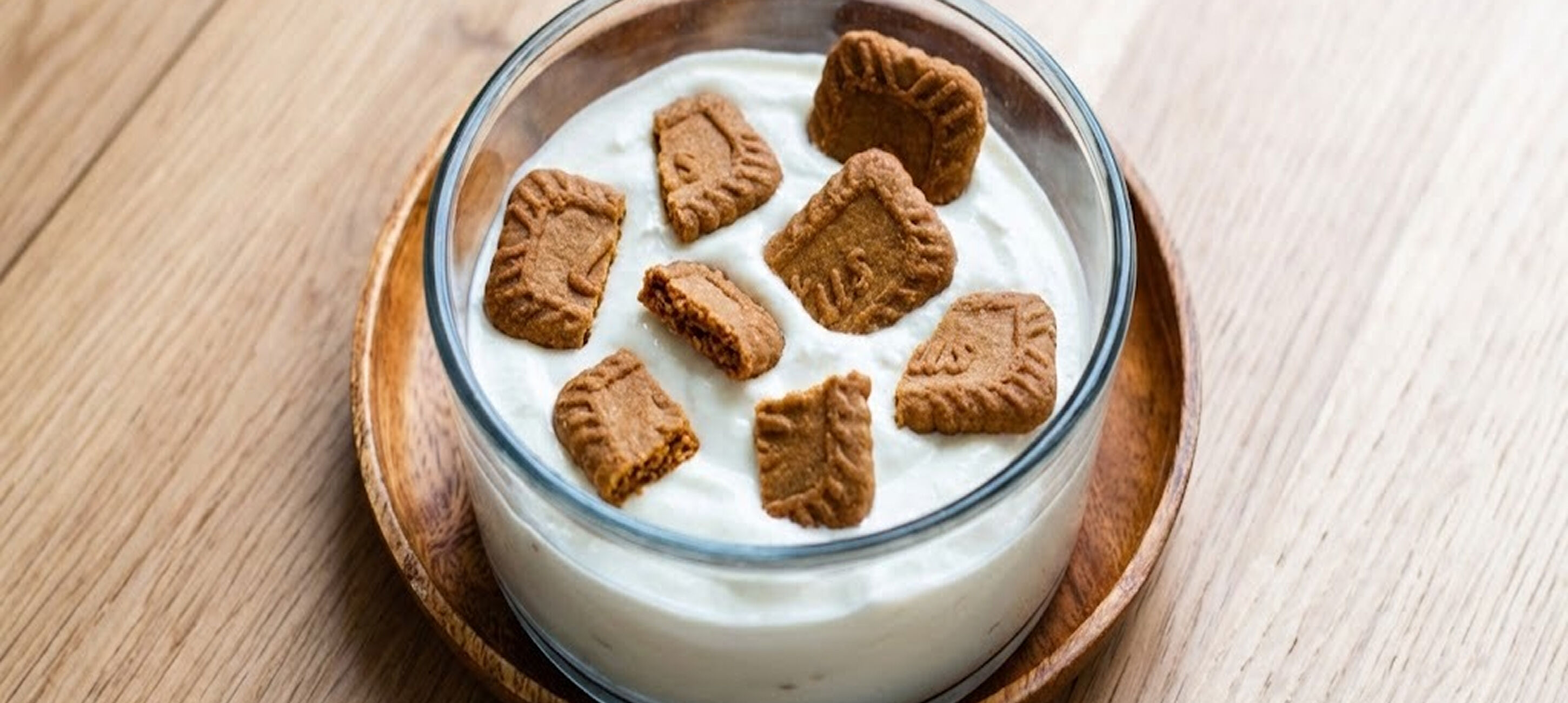 - 2Do jogurtu svisle zapíchejte co nejvíce sušenek Lotus Biscoff. Mezi sušenkami nechte jen minimální prostor. Čím více sušenek přidáte, tím výraznější bude karamelová chuť a dezert bude mít hutnější strukturu.