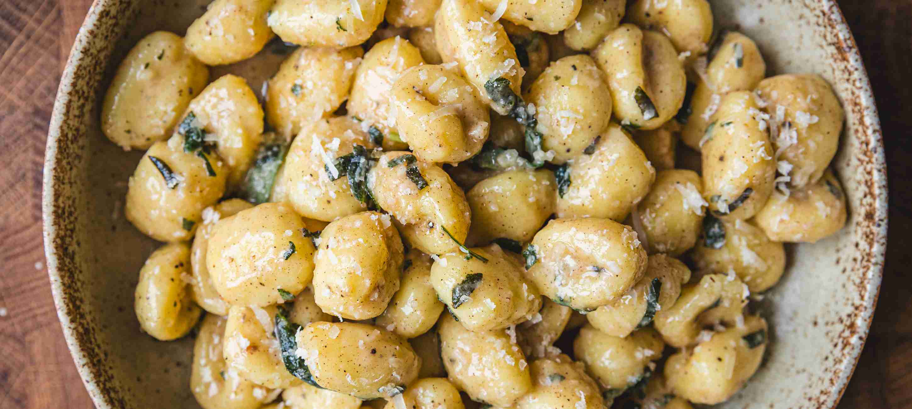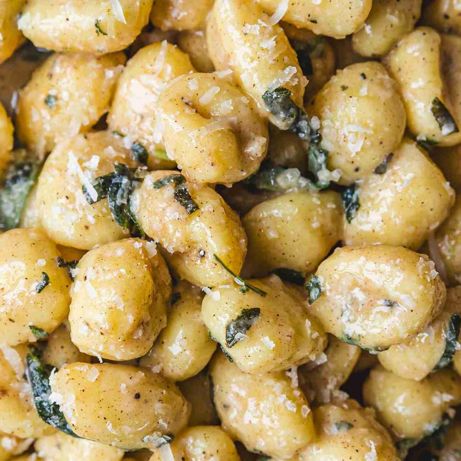 - 3Jakmile se voda vaří, přidejte gnocchi, a když vyplavou na hladinu, ihned je z hrnce odeberte a přidejte rovnou do pánve k máslu. Promíchejte, přisypte najemno nastrouhaný parmazán a zlehka promíchejte. Hotová omáčka by měla být lesklá a sametová, pokud je až moc tuhá, přidejte trochu vody, ve které se gnocchi vařily.