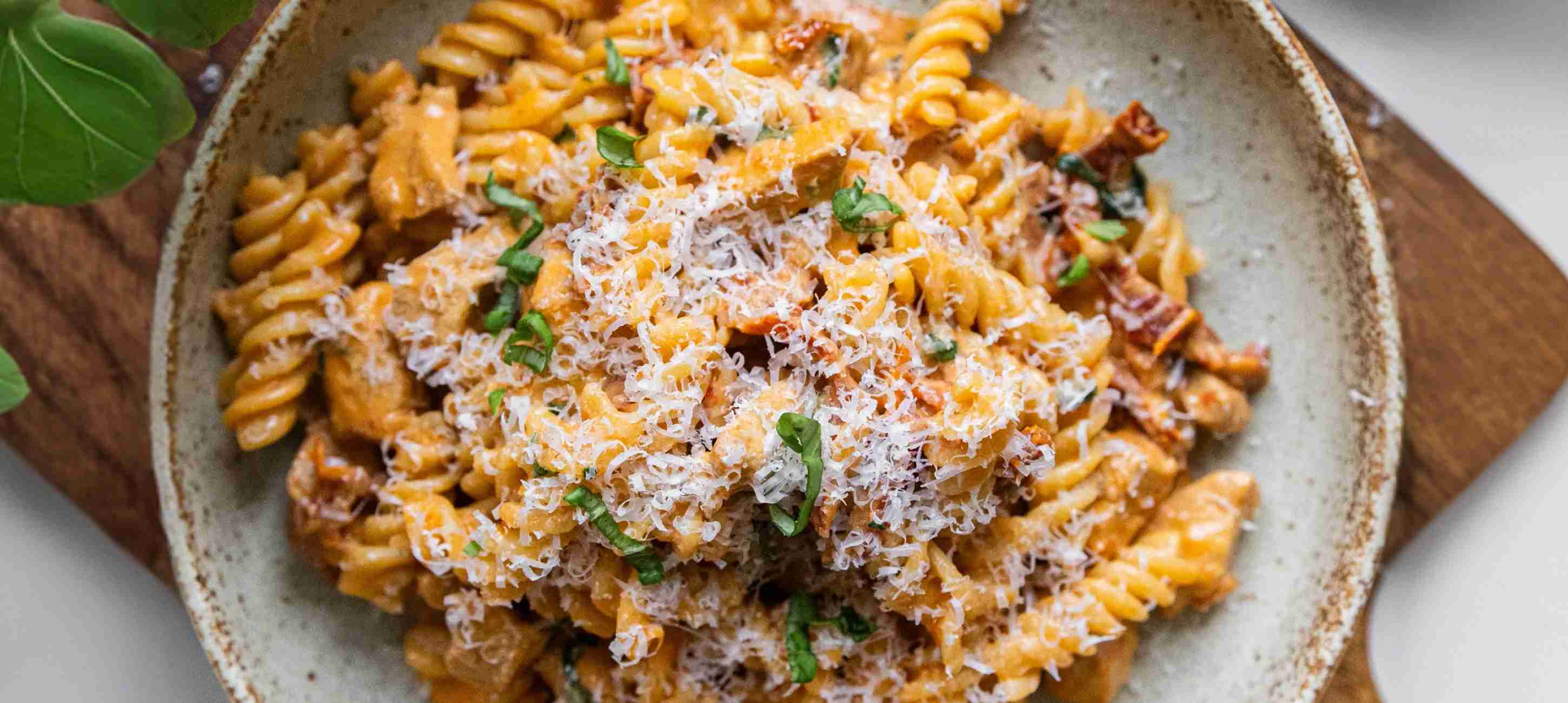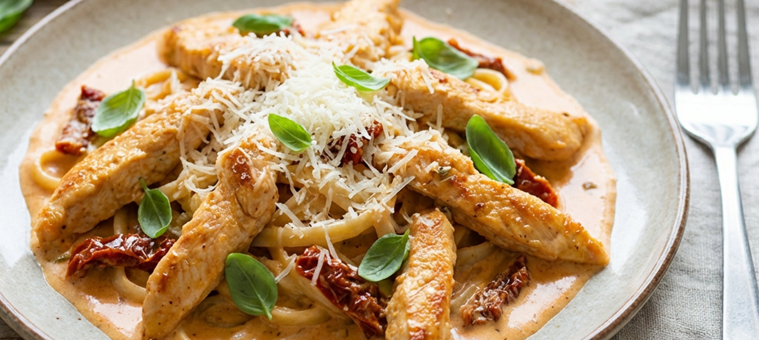 - 1Velký hrnec naplňte vodou, pořádně ji osolte a dejte vařit. Mezitím si nakrájejte cibuli nadrobno, česnek na tenké plátky a sušená rajčata na menší kousky. Kuřecí prsa očistěte a nakrájejte na nudličky nebo menší sousta.