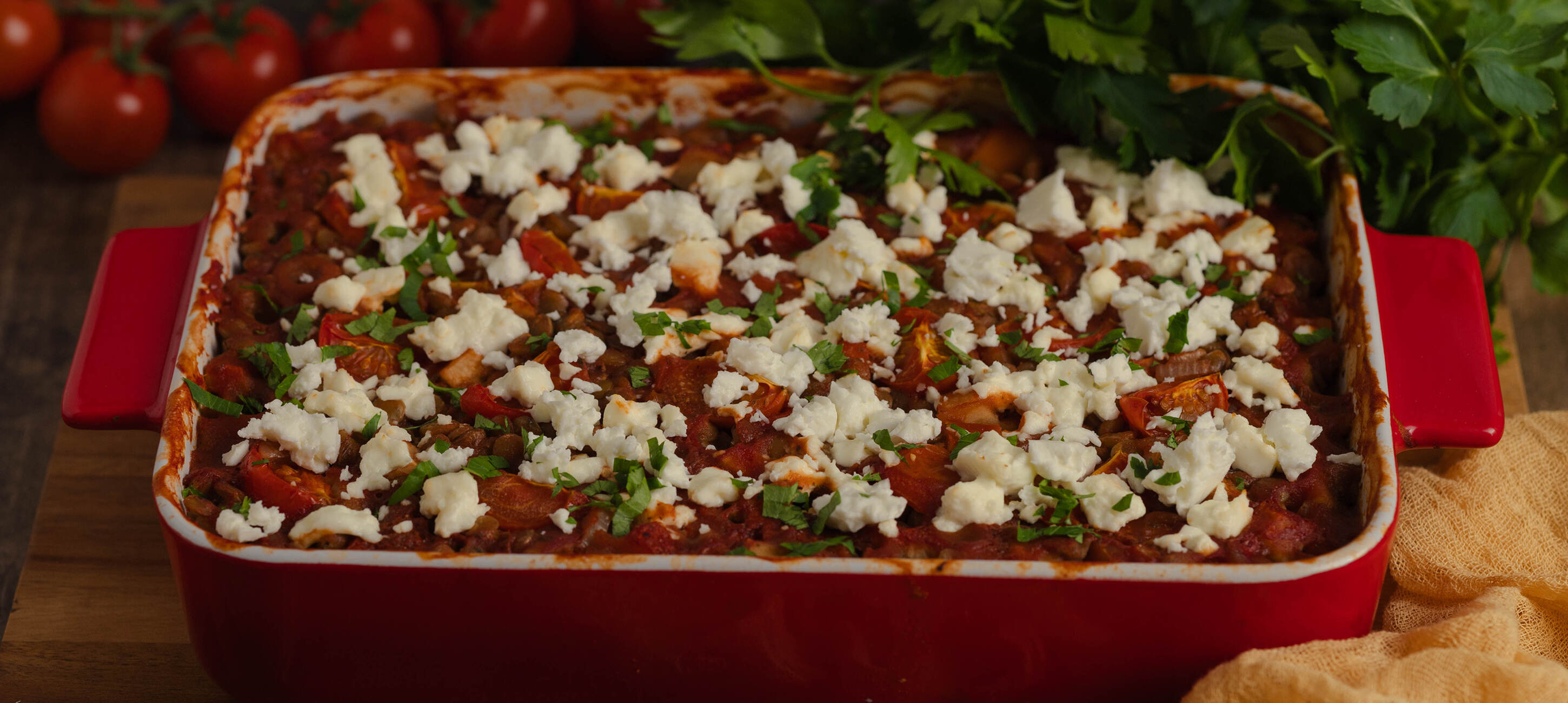 - 4Čočku scedíme, přidáme nakrájenou zeleninu, česnek, pasírovaná rajčata, zeleninový vývar, koření a sůl. Promícháme. Přendáme do zapékací mísy a pečeme ve střední části trouby do změknutí zeleniny. Trvá to přibližně 40 - 50 minut. 5 minut před dopečením na povrch nadrobíme feta sýr.