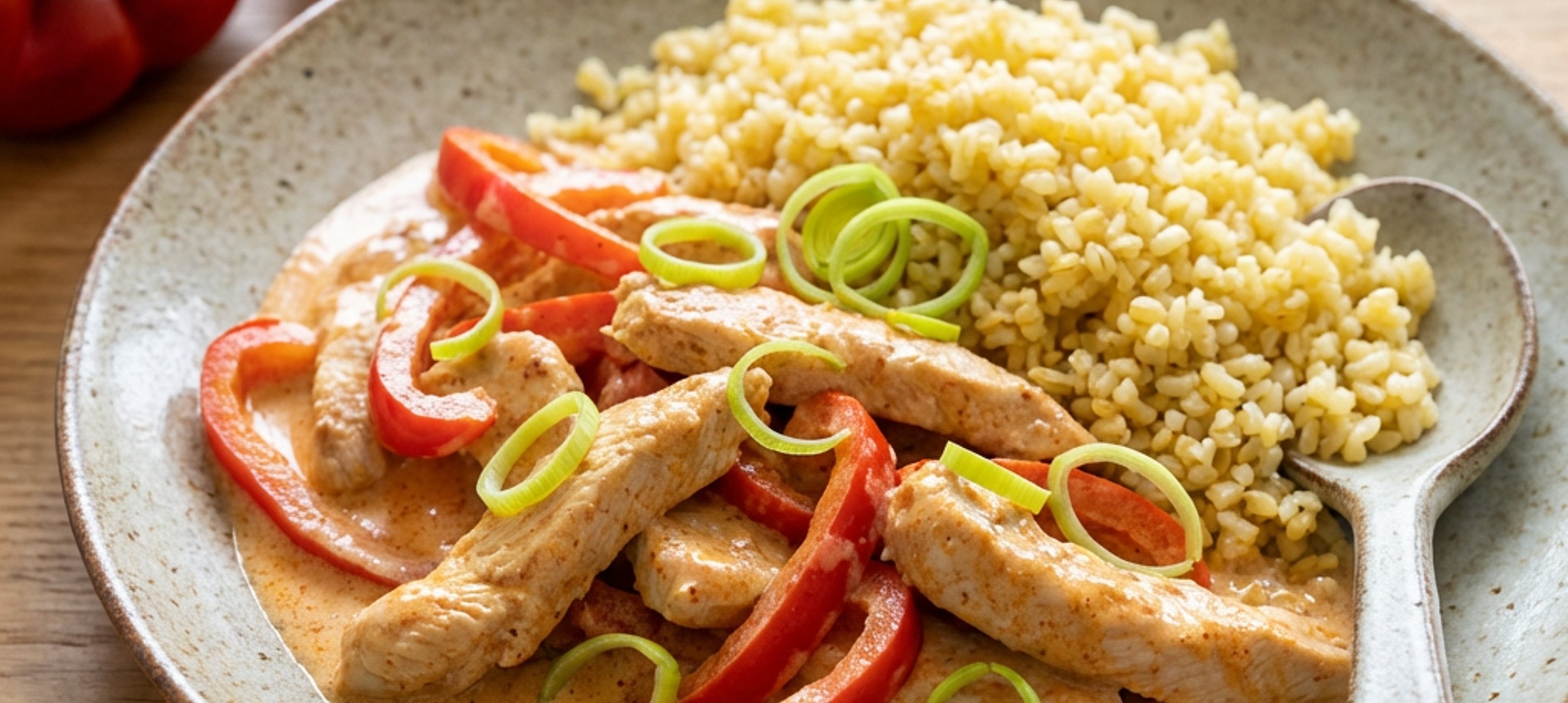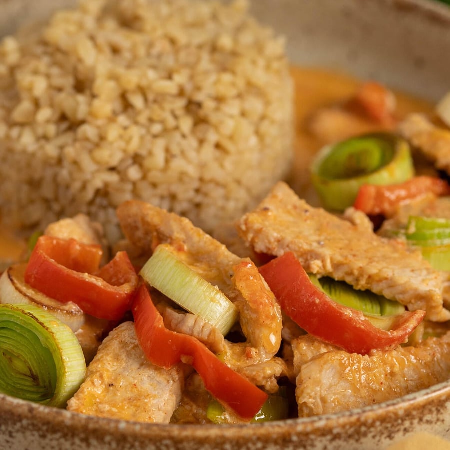 - 2Řecký jogurt vytáhneme z lednice, aby získal pokojovou teplotu. Zeleninu omyjeme. Světlou část pórku nakrájíme na silnější kolečka, papriku na proužky a česnek prolisujeme. Krůtí maso nakrájíme přes vlákna na proužky, lehce osolíme a opepříme.