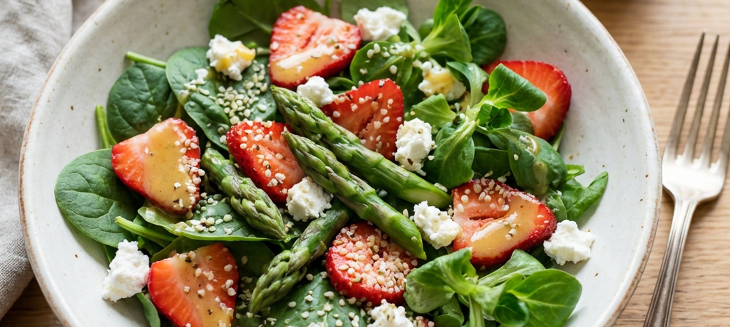 - 3Ve velké míse opatrně promíchejte polníček, baby špenát, polovinu jahod a uvařený chřest s připravenou zálivkou.