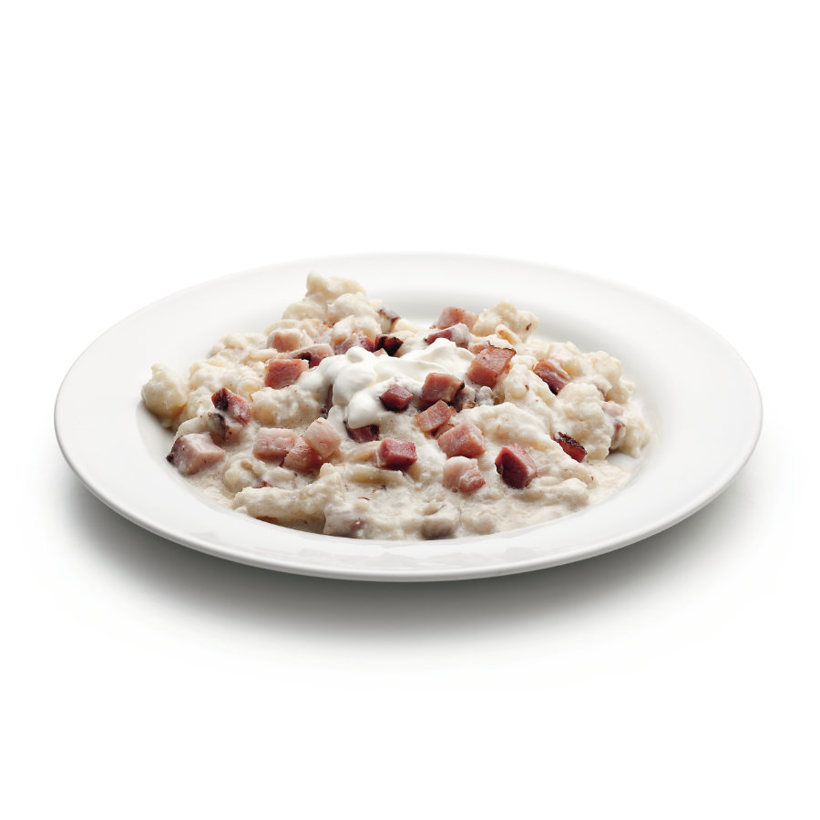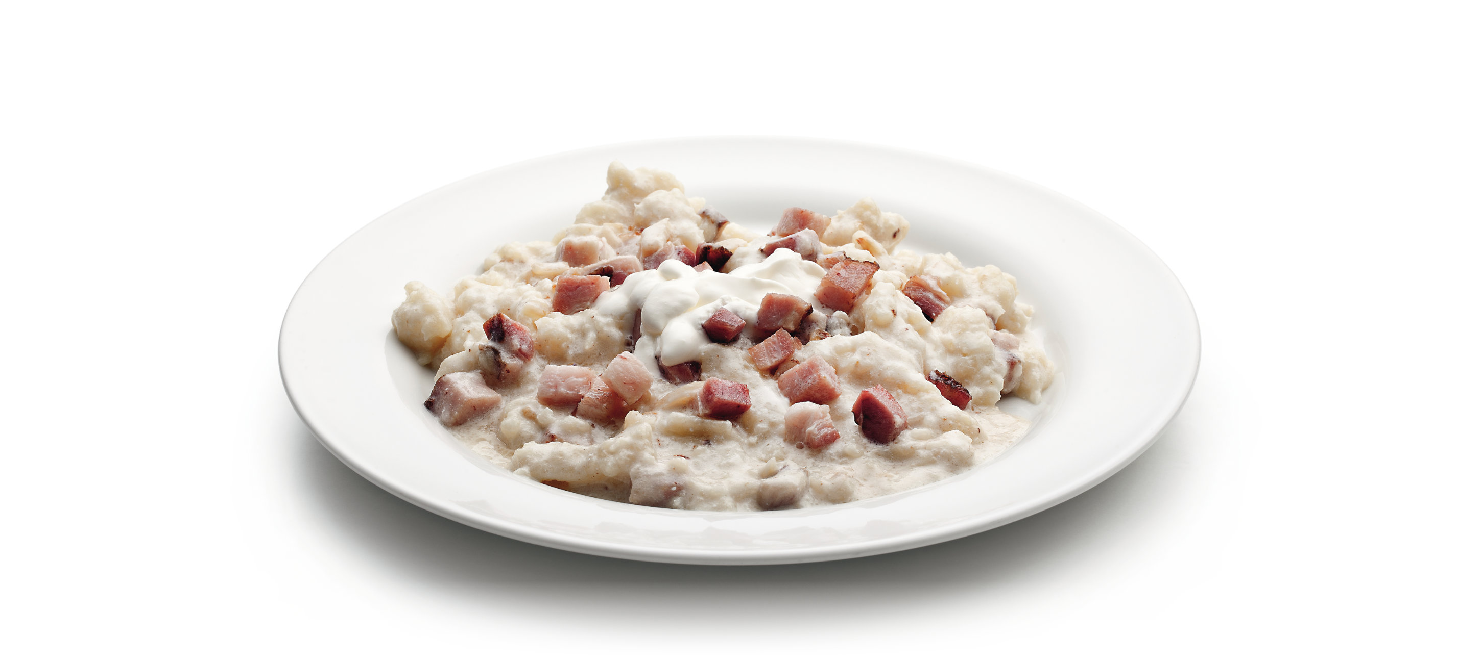 - 3Každou dávku v míse pokryjeme částí nadrobené brynzy, která se na nich rozpustí. Poslední vrstvu zalijeme horkou zálivkou ze smetany, mléka, cibule a slaniny. Lehce promícháme. Na talíři dochutíme lžičkou zakysané smetany.
