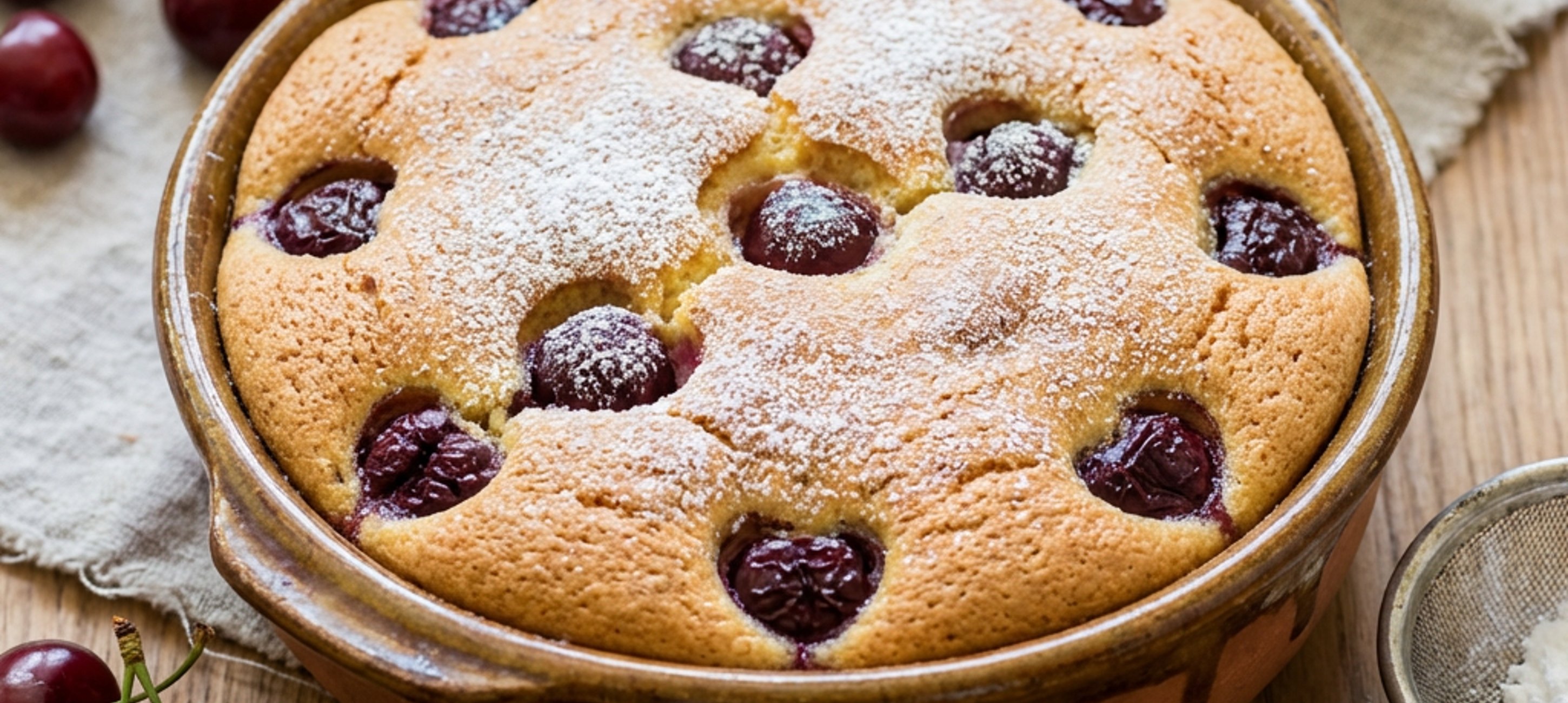 - 3Těsto pomalu nalijeme do vymazaného a vysypaného pekáče a poklademe vypeckovanými třešněmi. Vložíme do rozehřáté trouby a pečeme zhruba 30 minut dorůžova.