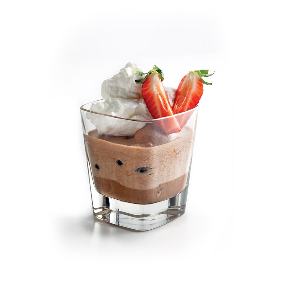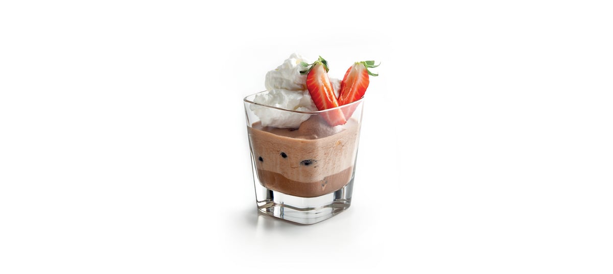 - 5Na dno sklenic naskládáme piškoty, ovoce a zalijeme čokoládovou pěnou 0,5 cm pod okraj. Dáme na 20 minut chladit do ledničky.
