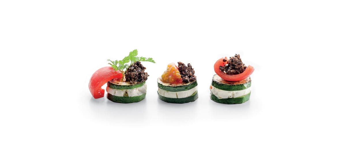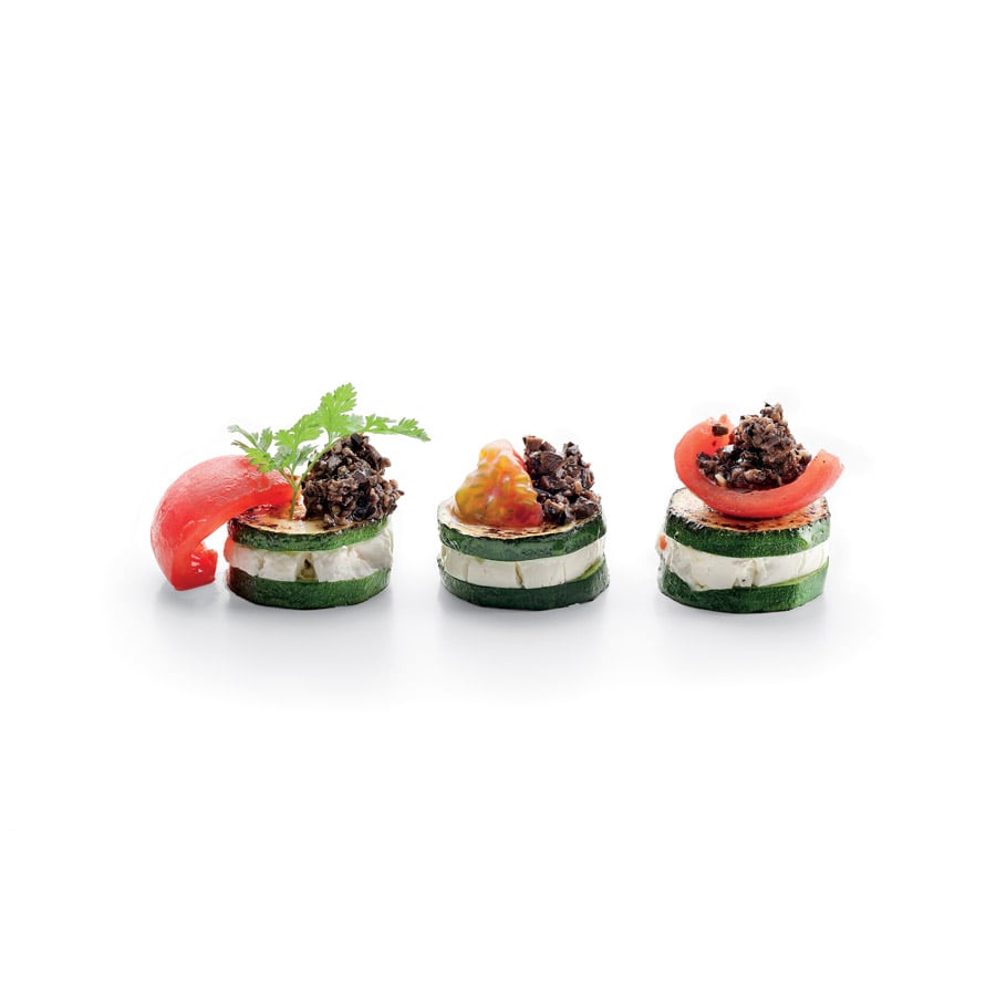- 3Kozí sýr nakrájíme na 3 porce velké jako kolečka cukety. 1 porci sýra vložíme mezi 2 plátky opečené cukety.