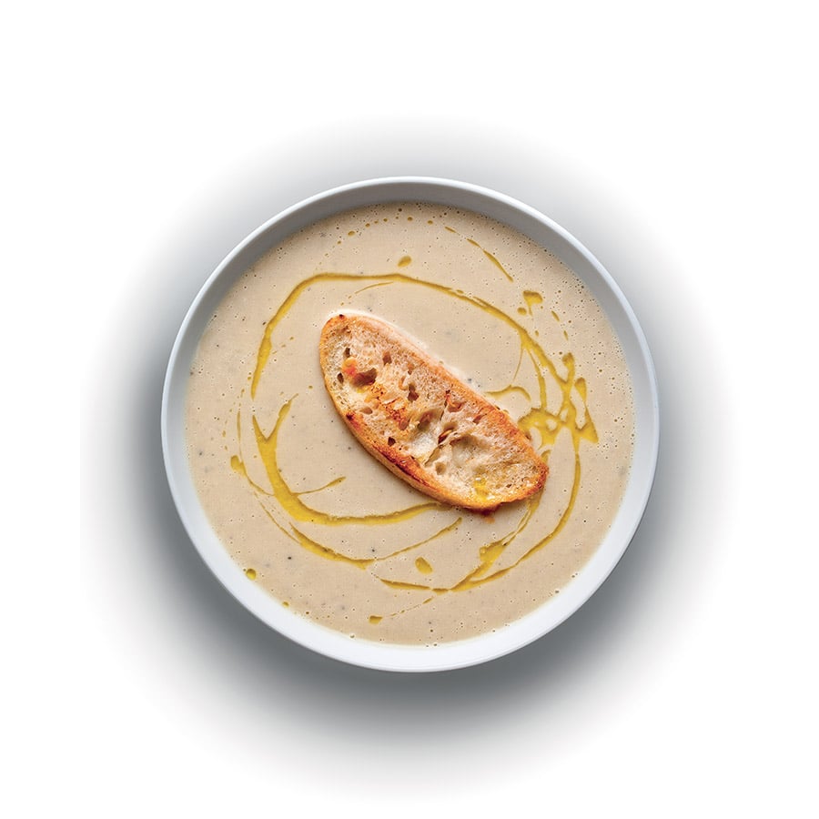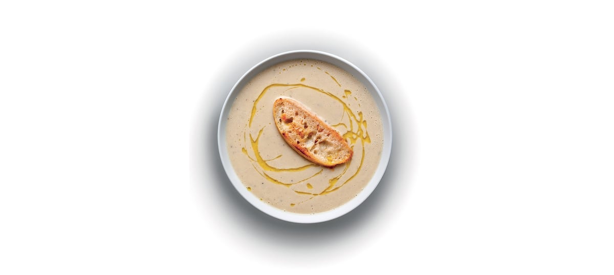 - 4Rajče rozřízneme napůl. Plátky ciabatty opečeme z obou stran nasucho na pánvi, potřeme je česnekem a řeznou plochou do nich vetřeme rajče. Podáváme k polévce, kterou v talíři zakápneme olivovým olejem.