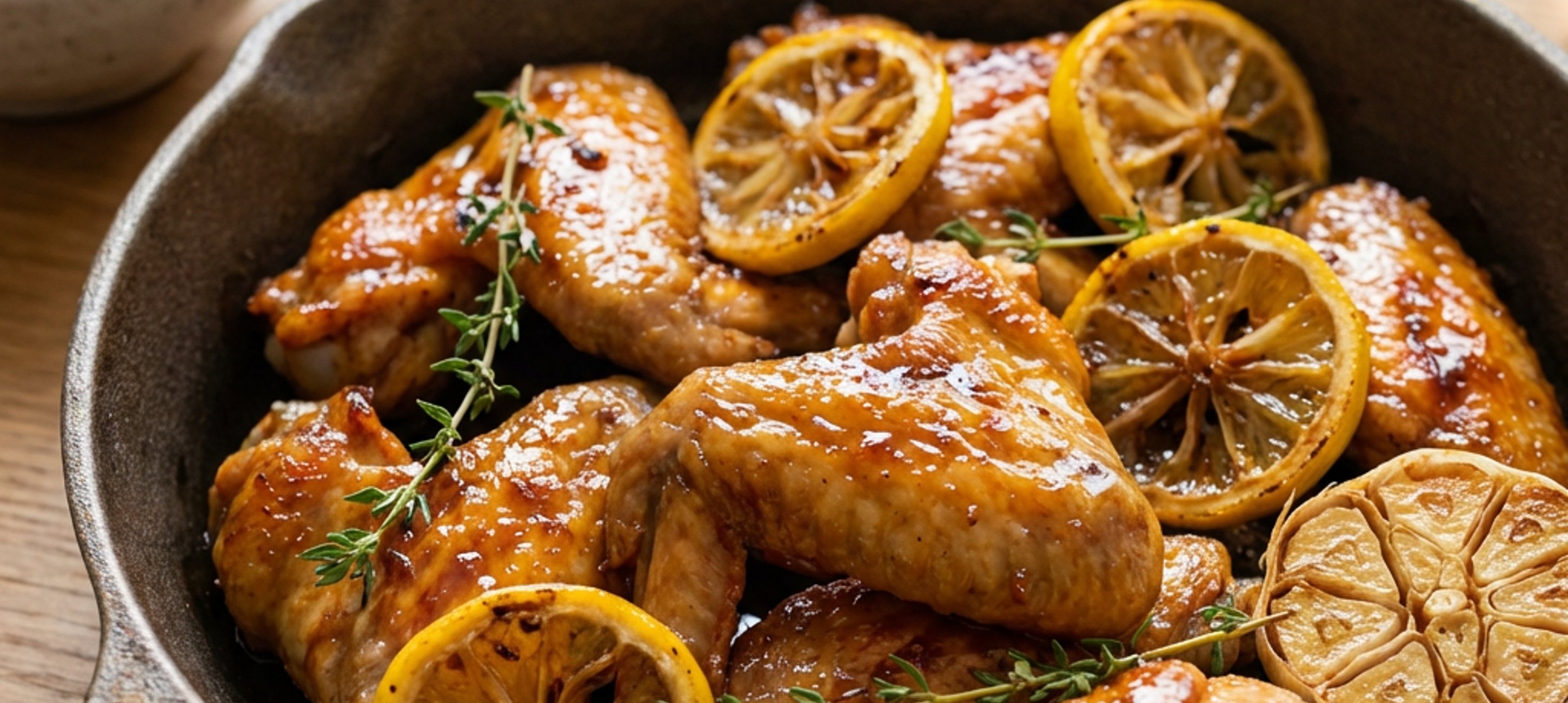 - 4Zvýšíme oheň a do pánve k masu přidáme česnek řeznou plochou dolů, tymián, kolečka citronu, chilli papričky, ocet, víno a pomerančovou kůru. Víno necháme odvařit. Přilijeme 400 ml vody, med a sójovou omáčku. Promícháme, přiklopíme poklicí a necháme na mírném ohni dusit doměkka.