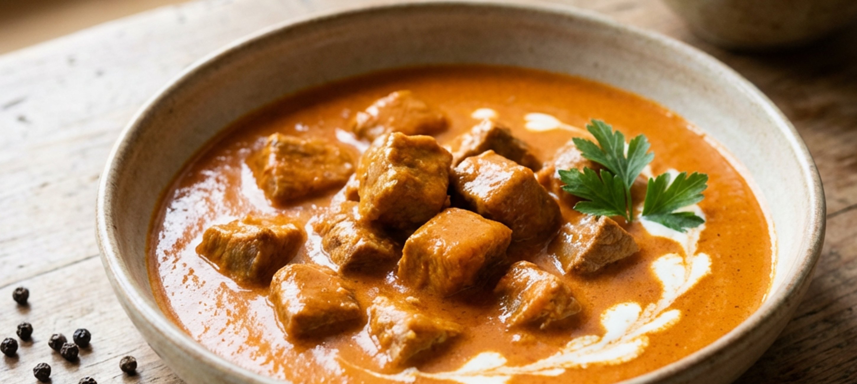 - 3V kastrolu na středním ohni rozehřejeme zbylé másla, přidáme cibuli a necháme ji zesklovatět. Občas zamícháme. Přidáme sladkou papriku a rajský protlak a 30 vteřin za stálého míchání restujeme. Přidáme zblanšírované maso. Osolíme 2 lžičkami soli, dochutíme čerstvě mletým pepřem a zalijeme vývarem jen tak, aby maso bylo téměř potopené. Přivedeme k varu, přidáme koření, promícháme, přiklopíme pokličkou, stáhneme oheň pod třetinu a necháme dusit doměkka. Občas vše promícháme a v případě potřeby dolijeme vývar, aby bylo maso téměř potopené.