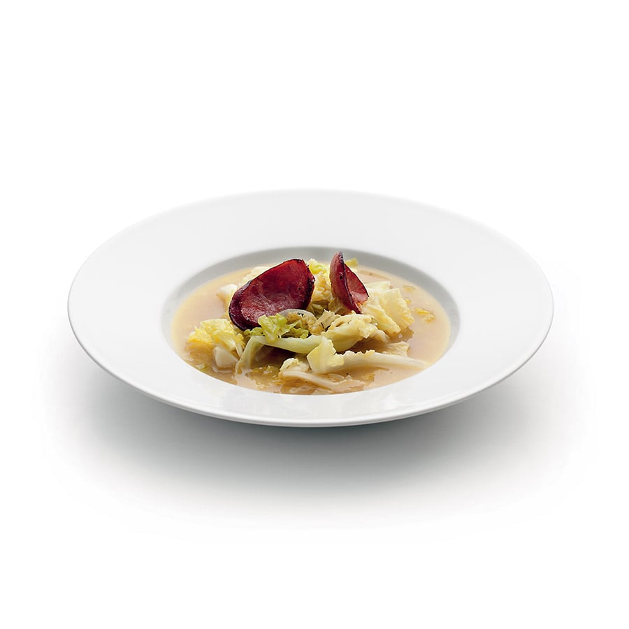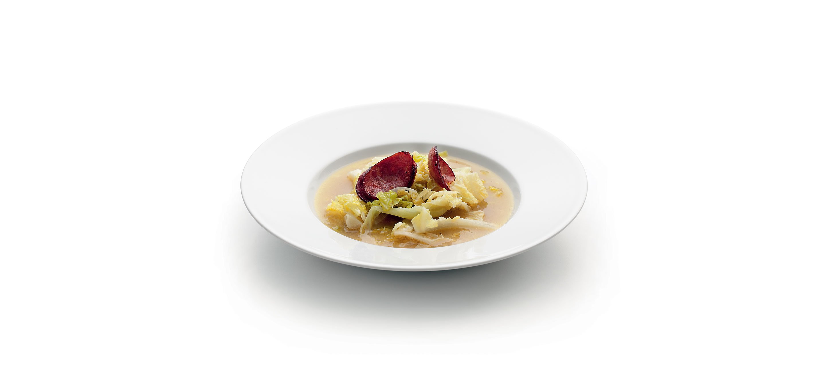 - 2V kastrolu na středním ohni rozehřejeme 50 g másla, přidáme cibuli a necháme ji zpěnit. Přidáme kapustu a česnek a za stálého míchání je půl minuty restujeme. Přidáme mouku. Za stálého míchání 1 minutu restujeme. Přilijeme vývar a promícháme. Polévku přivedeme k varu, oheň stáhneme na méně než třetinu a vaříme nezakryté 18 minut.