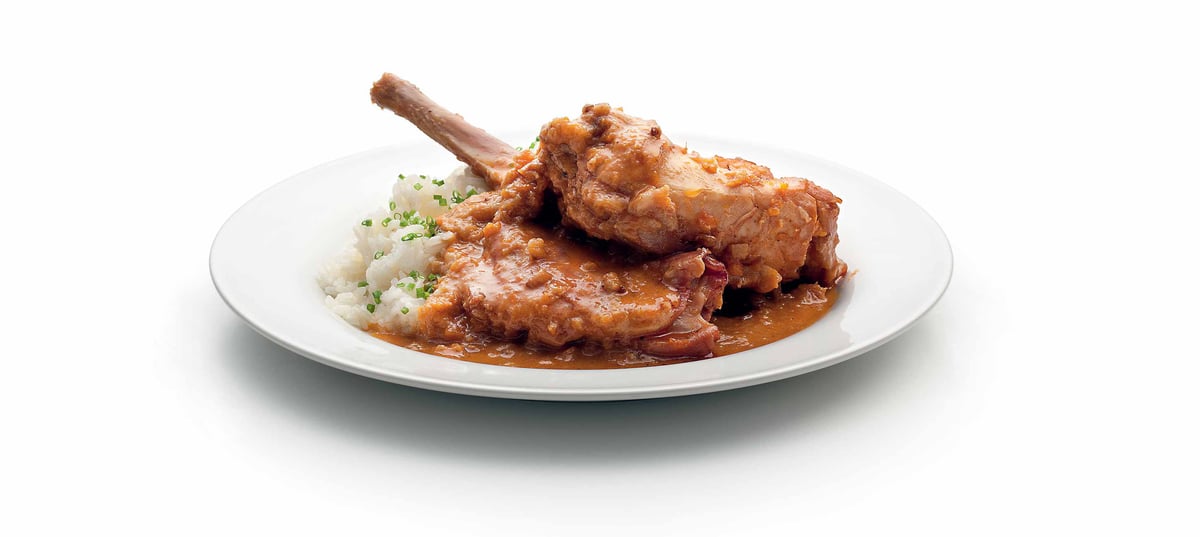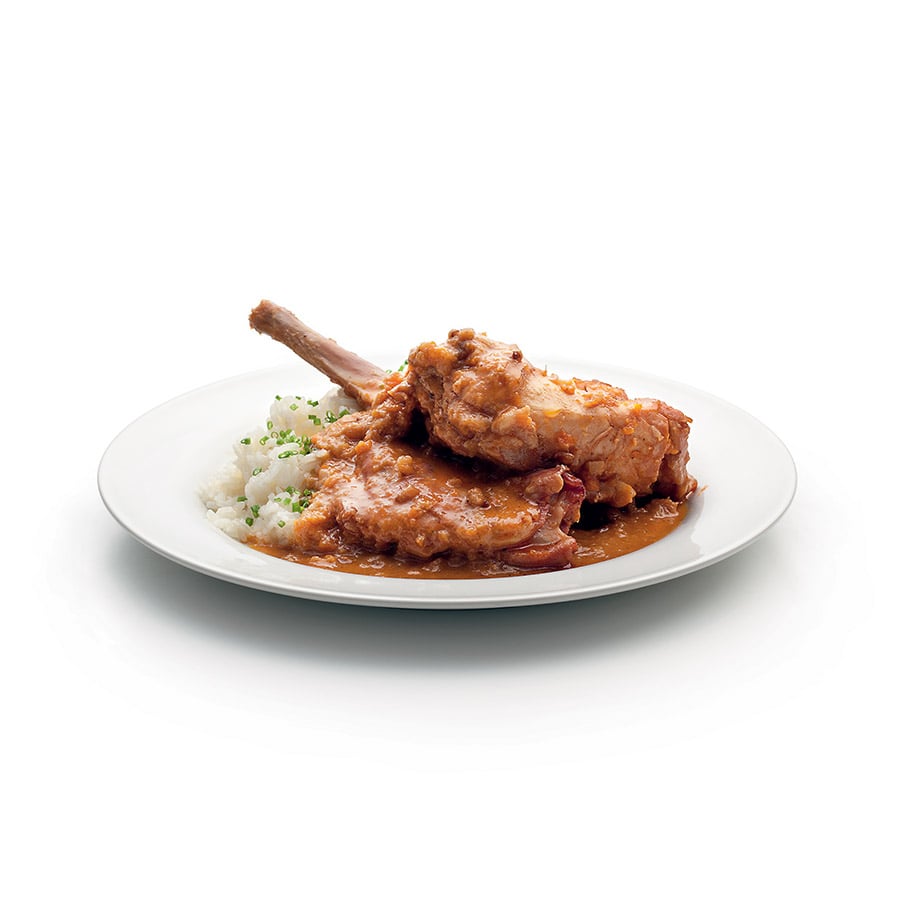 - 7Do kastrolu přilijeme zbytek vývaru a tekutinu svaříme na polovinu. Králíka vrátíme prohřát. Podáváme s dušenou rýží.