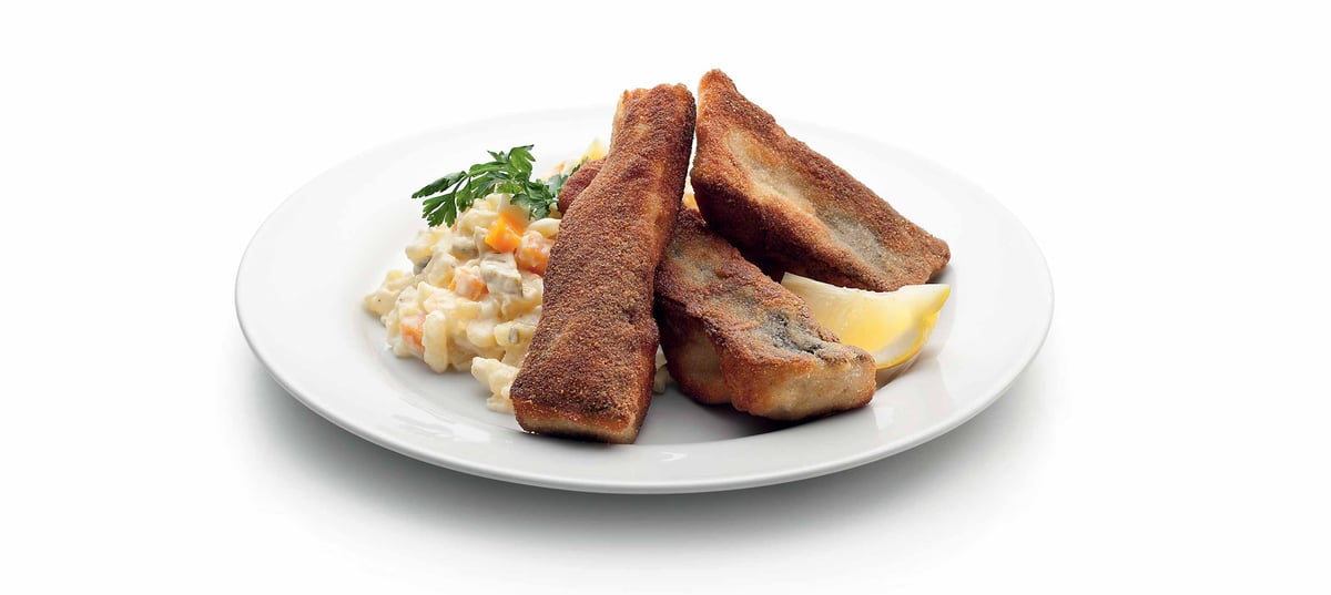 - 4Serve the fried carp with a wedge of lemon and potato salad.