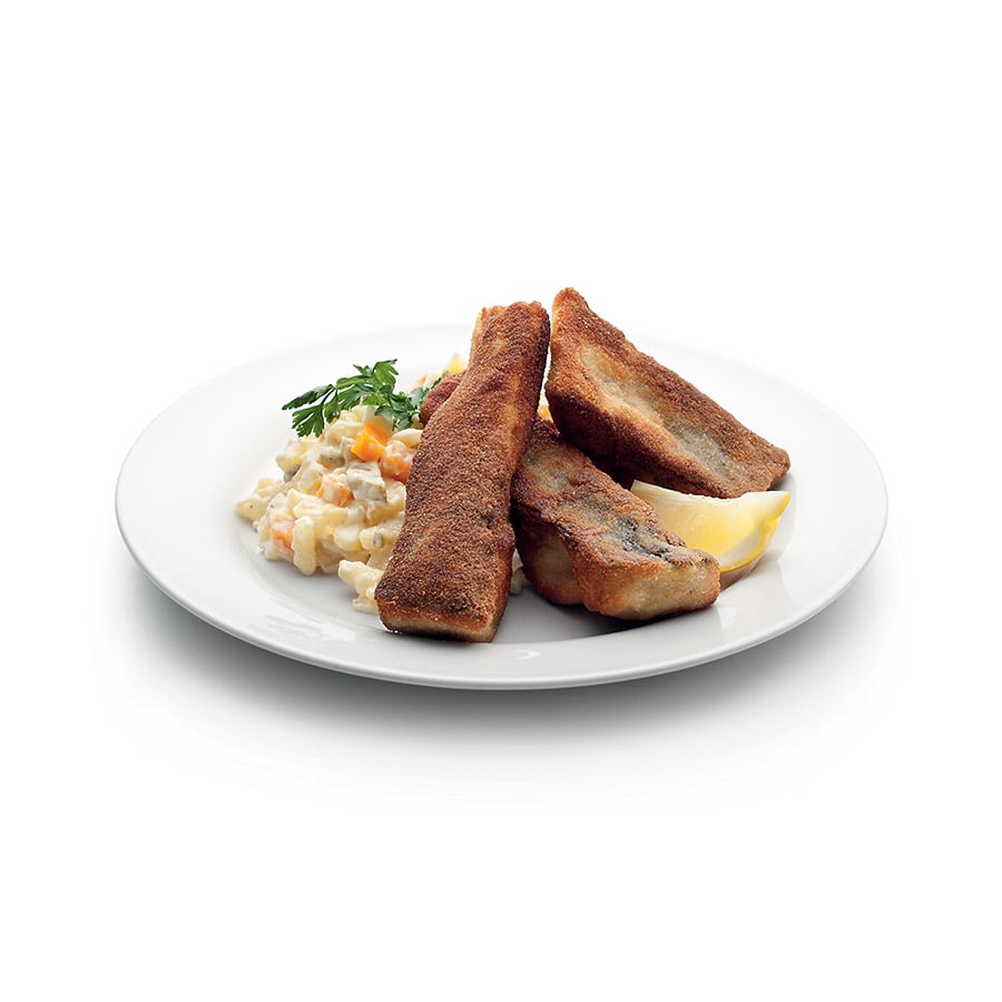 - 1Season the fillets with salt on all sides and coat them first in plain flour, then in beaten eggs, and finally in breadcrumbs.