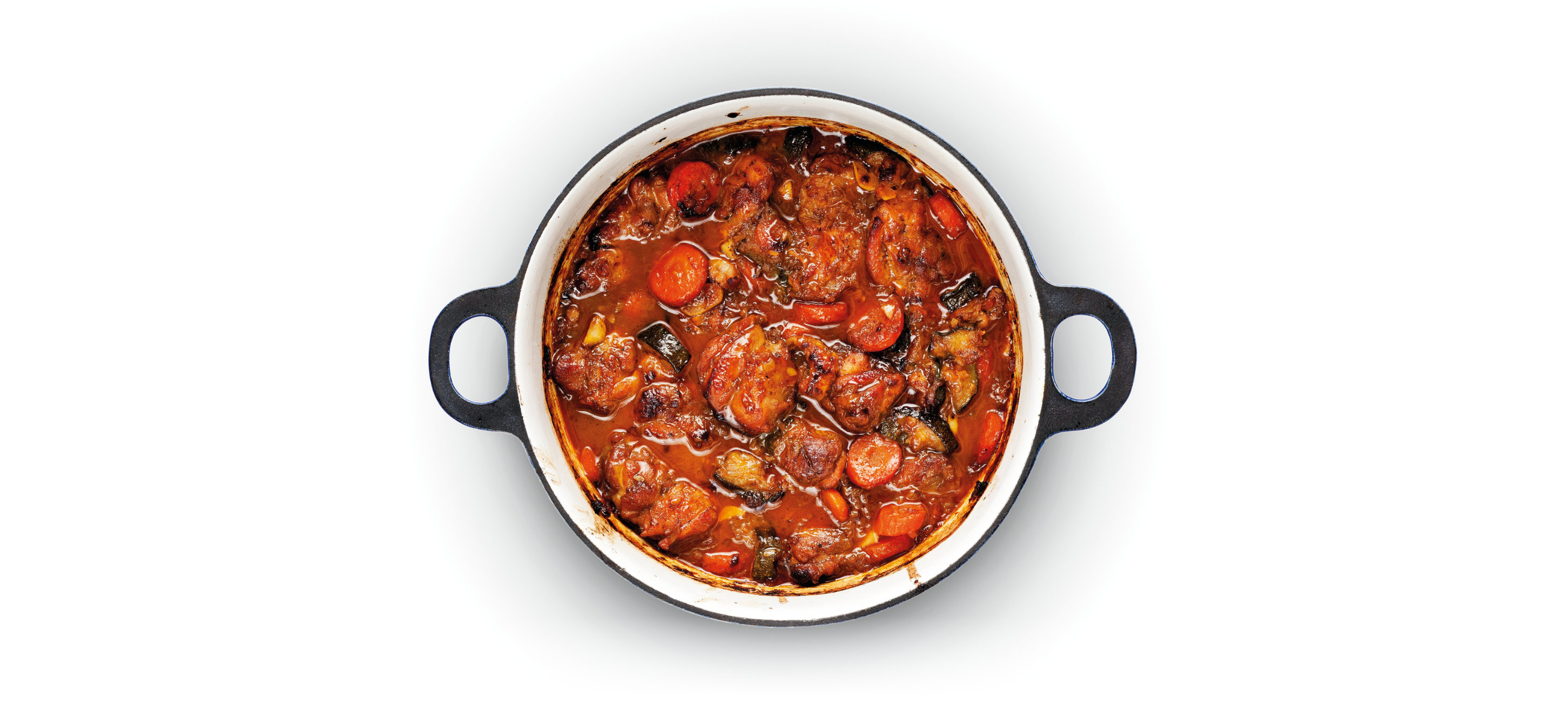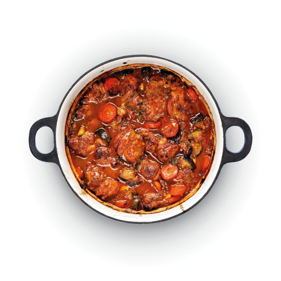 - 6Přidáme česnek a zázvor, promícháme a za občasného míchání pečeme 2 minuty. Kastrol stáhneme z ohně a vyskládáme do něj opečené maso kůží nahoru.